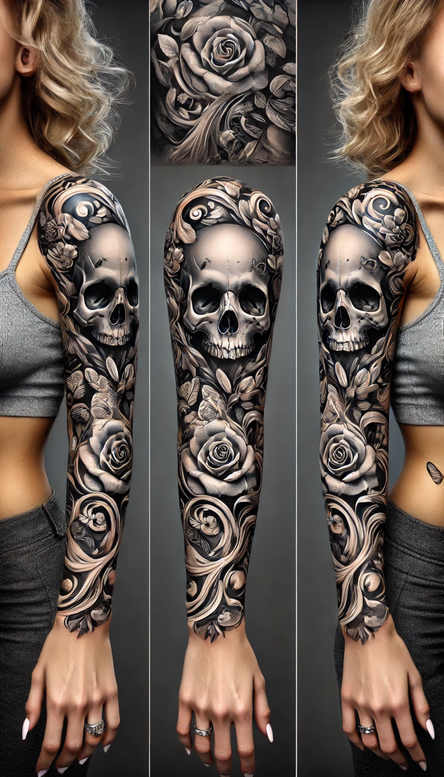 AI-generated tattoo project: a highly detailed black and grey sleeve composition featuring a central skull entwined with roses and curling foliage. The piece blends realism with ornamental botanical elements, creating a dense silhouette that flows from upper arm to wrist. The skull is rendered with precise gradient shading to emphasize hollow eye sockets, nasal cavity, and teeth, while the roses weave around it in varying tones of grey, their petals layered to convey depth and texture. Leaves and vines provide negative space and movement, guiding the eye along the arm and reinforcing a narrative of life, memory, and mortality. The treatment leans toward realistic black and grey finish, with smooth transitions from midtones to deep shadows and crisp line work for longevity on skin. The design uses tonal contrasts to separate foreground elements from background shading, ensuring legibility as the skin ages and the tattoo settles. As a cover-up-ready design, its dark background and dense shadowing can effectively mask older ink, while the obstruction created by petals and leaves allows a natural blending with new lines. The composition is intentionally vertical, designed to wrap the arm in a continuous loop, with the skull anchored as the focal point and roses acting as frames that elongate the limb. Clients often choose skull-and-rose motifs for their symbolism—mortality and beauty, endurance and renewal—while the botanical patterning adds rhythm and flow suitable for full sleeve expansion. This concept can be adapted for forearm extensions or upper-arm panels, preserving tonal balance, proportion, and readability. Considerations for placement include skin texture, prior tattoos, and aftercare for a long-lasting dark finish. The piece fits within the broader lexicon of tattoo design and body art, offering a strong statement with classic motifs and modern shading techniques. Keywords: tattoo, tattoo design, meaningful tattoos, rose tattoo design, black and grey, realistic tattoo, pattern, cover-up, ink.