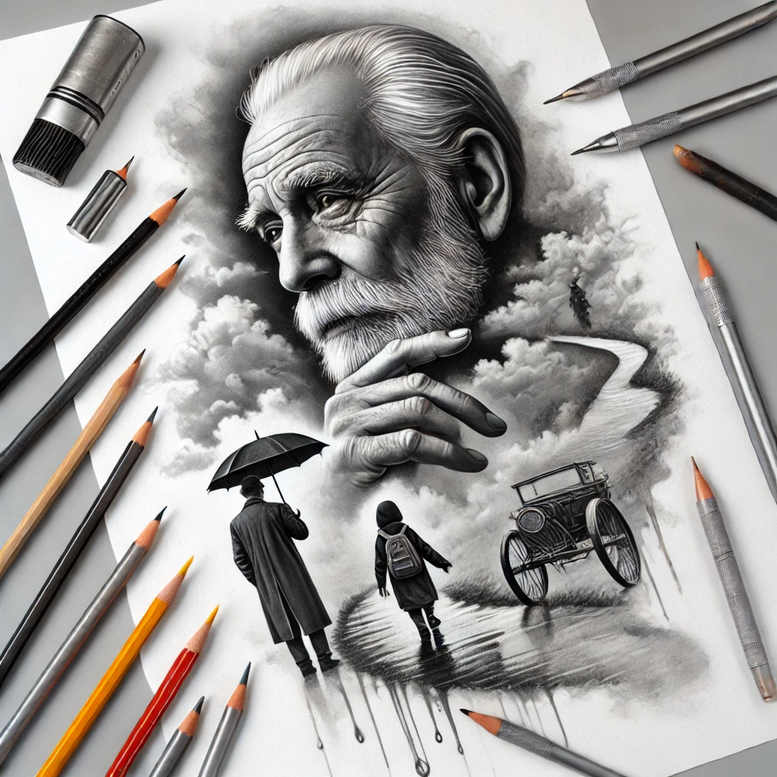 AI-generated tattoo project concept, presented as a cinematic black and grey composition. The focal point is a large, contemplative elder man’s face rendered with graphite-like shading to convey wisdom and memory. Surrounding elements drift into a moody atmosphere: clouds swirl overhead, while rain-darkened ground pulls the eye toward a winding road that disappears into a distant horizon. In the foreground, a figure with an umbrella stands against the weather, accompanied by a child wearing a backpack, suggesting guidance, journey, and growth. A vintage carriage sits beside the roadside, providing a nostalgic counterpoint to modern life and hinting at stories carried through time. The piece uses sharp contrast between the deep blacks and soft grey transitions to create depth, texture, and a sense of movement, while negative space helps isolate key motifs and makes the scene legible as a tattoo design. The symbolism is deliberate: elder as keeper of memory, umbrella as protection from life’s storms, road as the path of experience, carriage as a link to the past, child as potential and innocence. This concept fits well within meaningful tattoos and fine line tattoo traditions when adapted for skin, while remaining a strong example of black and grey realism and custom tattoo design. It also functions as a cover-up concept, where bold black blocks can obscure an older tattoo, and the surrounding shading can blend into a seamless transition. As an AI-generated concept, it offers a flexible blueprint for artists to tailor line density, scale, and placement, delivering a timeless body art piece that reads clearly at a distance and rewards closer inspection with intricate shading and narrative depth.