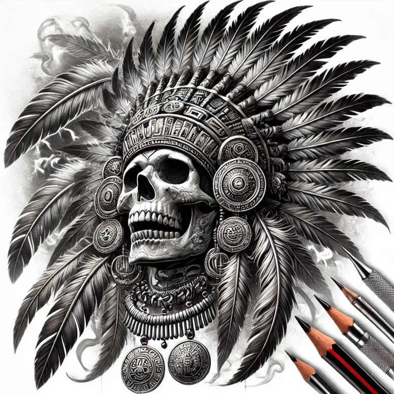 AI-generated tattoo project rendered in a high-contrast black and grey palette, this skull wearing an ornate Aztec headdress blends realism with decorative patterning. The composition centers a stark skull framed by long feathers, with round coins and layered bead necklaces that draw the eye outward. Expert shading transitions from deep black to soft gray, creating volume on bone, fabric, and quills, while crisp line work defines the headdress motifs. Sized for bold impact, the piece could anchor a larger back or shoulder sleeve, or be refined into a smaller tattoo with retained detail. The Aztec motif adds cultural symbolism of heritage and mortality, while the jewelry hints at ritual value and memory. As an AI-generated tattoo project, it showcases contemporary capabilities for cohesive, intricate designs that balance graphic pattern with lifelike texture. Its dense ink makes it an excellent cover-up option, capable of concealing existing work while preserving ornamental detail. Though primarily realistic, the feather texture provides delicate contrast against the solid shadows, ensuring legibility and longevity across skin tones. Overall this piece merges cultural resonance with bold portraiture, delivering a striking, versatile tattoo concept for clients seeking a dramatic, symbolic image.