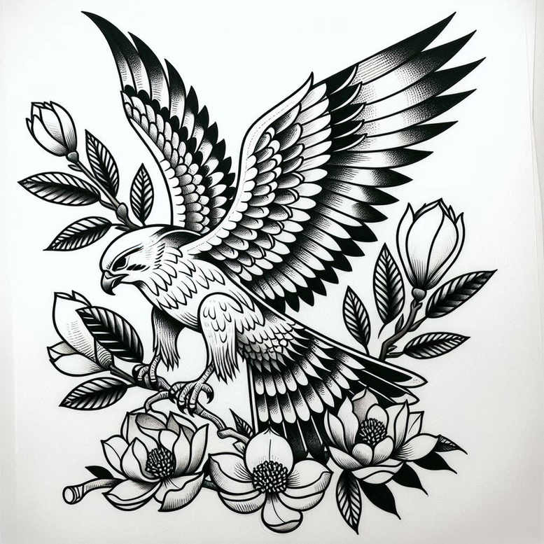 AI-generated tattoo project concept presented in a professional, magazine-ready tone, this black and grey linework design features an eagle with outstretched wings perched on a branch among blooming flowers. The composition relies on bold outlines and intricate feather patterning, with repeating motifs across the wings, chest, and tail that read as a cohesive graphic pattern rather than soft shading. The blossoms resemble magnolias, their petals opening around the bird to create a natural frame that balances power and grace. Leaves and buds interlace with the branch, adding positive space and rhythm to the piece, while the negative space around the wings emphasizes contrast and legibility—a key consideration for both small tattoos and larger sleeves. The technique favors fine line tattoo sensibilities, with careful stippling and cross-hatching to produce depth without sacrificing clarity in black and grey ink. Symbolically, the eagle stands for courage and determination, while the flowers convey renewal and beauty; together they form a meaningful tattoo design for someone seeking a bold yet refined body art piece. This project showcases how graphic patterns can be integrated into traditional motifs, producing a pattern-rich texture that remains legible over time on skin. As an AI-generated tattoo project concept, it demonstrates the potential of AI-assisted design to inform classic tattoo aesthetics, offering a versatile template suitable for a custom tattoo design: a versatile motif for placement on the upper arm, shoulder, or back. The inclusion of pattern shading in the feathers and petals gives the tattoo a distinctive, tile-like texture that supports both realism in form and stylized graphic impact, aligning with trends in black and grey tattoos, small tattoos, and flower tattoos while maintaining a strong, iconic silhouette. Practically, this design can be adapted with Japanese style tattoo influences or kept strictly in a traditional black and grey palette, ensuring the end result remains a timeless piece of ink.