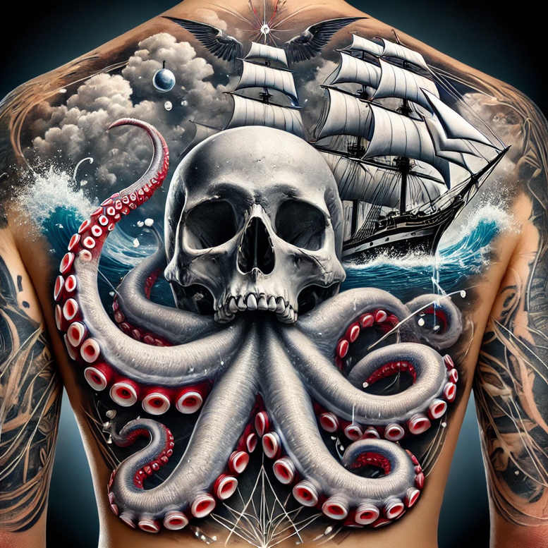 This AI-generated tattoo project presents a dramatic back piece that merges macabre symbolism with nautical epic. At the center sits a skull, its sockets and cheekbones carved with precise grayscale shading that gives bone a cinematic weight. A colossal octopus coils around the torso, its tentacles spiraling in front of and behind the skull, each suction cup defined with careful stippling and crisp highlight edges. Behind them a sailing ship drives through stylized waves; the sails catch a phantom wind, while the rigging is etched in fine lines. The sea swells are alive with motion, white foam carved against deep shadows to heighten contrast. Clouds drift on the horizon, completing a moody, cinematic backdrop. Graphic pattern elements abound: repeating suction cup rows, lattice-like rigging, and geometric water lines create a cohesive rhythm that unifies the scene. The technique emphasizes black and grey realism, with smooth gradients, precise line work for the sails and skull, and layered textures on the tentacles to produce a three-dimensional effect. Its density and darkness make it an excellent candidate for a cover-up of older ink, since bold silhouettes and dense shading can mask previous tattoos while offering a fresh narrative of voyage and mortality. Though AI-generated, the concept channels traditional tattoo motifs—skulls, nautical scenes, and sea creatures—making it a compelling choice for a large-scale piece.