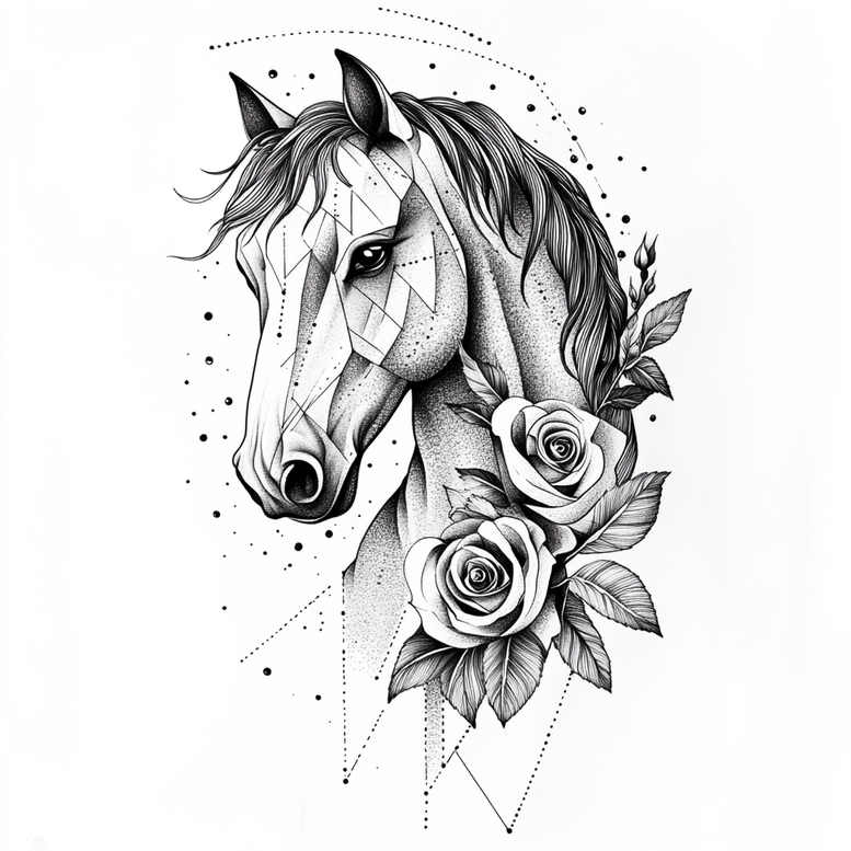 An AI-generated tattoo project presented as a refined black and grey composition that pairs a geometric interpretation of a horse head with a lush cluster of roses. The piece centers on a lifelike horse head drawn in clean linework, with faceted polygons crossing the face to create a faceted, crystalline appearance. The mane is rendered with delicate shading that transitions from solid black to soft gray, while the muzzle and nostrils gain depth through stippling and dotwork. Surrounding the head, two roses unfurl their layered petals, accompanied by leaves that curve along the neck, establishing a natural counterpoint to the angular geometry. Dotted arcs, fine lines, and trailing geometric connectors descend from the composition, contributing a celestial, almost shattered vibe. The overall effect is a pattern-rich tattoo design that blends realism with abstract geometry, a hallmark of modern black and grey tattoo art. The pattern elements are intentional, emphasizing the interplay between soft organic forms and sharp angular facets, making this a striking choice for tattoo enthusiasts who seek meaning and style in a single piece. The symbolism of the horse evokes freedom, grace, and strength, while the roses symbolize beauty and resilience; together they form a meaningful tattoo design that can be customized for placement on the shoulder, upper arm, or back. This piece demonstrates meticulous control of black ink, contrast, and negative space, employing fine line technique to achieve crisp outlines and delicate shading. For those drawn to small to medium-sized tattoos, the composition scales well, retaining detail at modest sizes or expanding with larger canvas. As an AI-generated tattoo project, it offers a unique template for a personalized version, and its pattern-driven geometry invites variations in floral arrangements or horse head rendering while preserving the core motif. The piece underscores how geometric patterning can elevate a traditional rose-and-animal portrait into a contemporary body art statement, aligning with current trends in Japanese-style and realistic black-and-grey tattoo design, as well as broader categories like tribal-influenced linework and fine-line tattoo aesthetics. It serves as a strong reference for anyone exploring meaningful tattoos, custom tattoo design, and the growing intersection of technology and ink in modern body art.