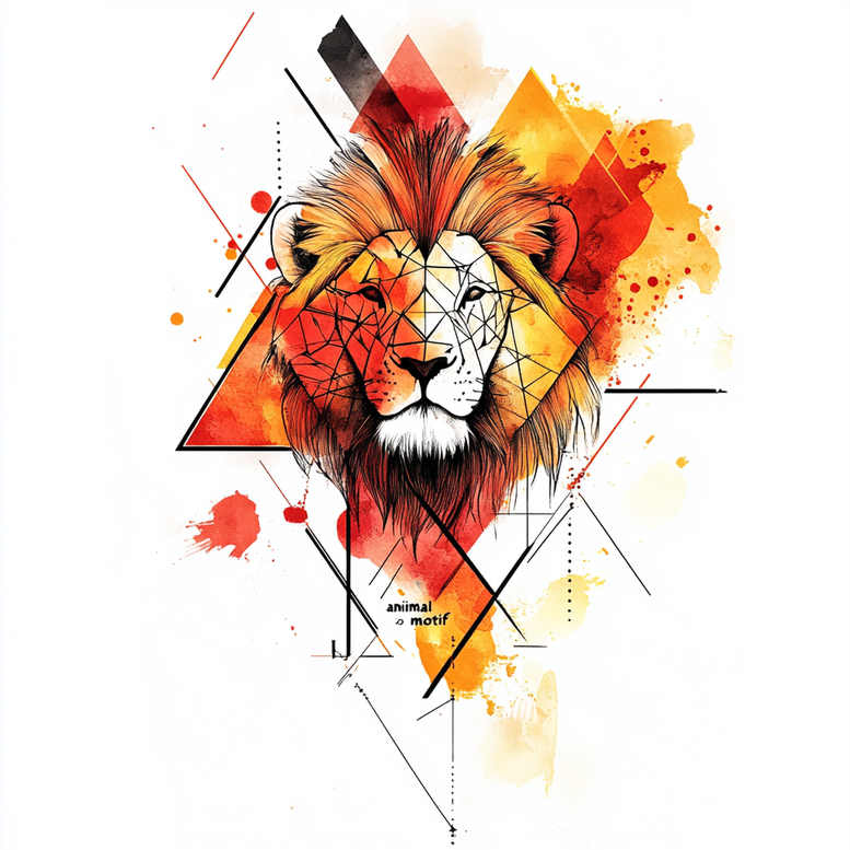 AI-generated tattoo project concept blending geometry and color, this lion head is crafted from polygonal facets and interlocking triangles, with linework that slices through the mane to create a crisp, contemporary silhouette. The composition sits against a field of watercolor splashes in red, orange, and yellow, allowing the warm pigments to breathe around the linear geometry and produce a strong sense of movement. The mane transitions from jagged geometric shards at the crown to smoother brush-like strokes near the jaw, a duality that conveys both precision and energy. Details such as the eyes, nose, and whiskers are rendered with controlled fine lines to maintain legibility on skin, while the surrounding triangles and lines create a pattern that feels modern yet timeless. The color theory relies on a high-contrast palette that makes the design pop on any skin tone, and the overall piece reads as a bold statement tattoo that can scale from a small forearm piece to a full-back composition. This tattoo design can be interpreted as a symbol of courage, leadership, and inner fire, aligning with meaningful tattoos that celebrate strength of character. It nods to a variety of traditions—from tribal tattoo geometry to Japanese-inspired geometry—while remaining accessible to lovers of ink who favor colored, graphic representations over purely black and grey work. As an AI-generated concept, it showcases how algorithmic ideas can translate into wearable art with a strong silhouette and a dynamic, pattern-rich surface. The main motifs are the lion, triangles, lines, and watercolor splashes, all engineered to read clearly in ink and to render a striking image that holds up at different sizes as a stand-alone piece or as an anchor for future sleeve ideas.