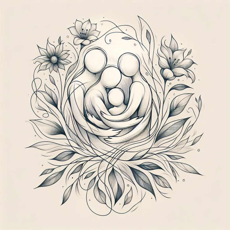 Presented as an AI-generated tattoo project, this fine-line black-and-grey composition centers on a family embracing motif framed by a veil of floral tendrils. The design uses clean, continuous lines with subtle cross-hatching to build depth while preserving a light overall feel for longevity in tattoo ink. At the core, three rounded forms suggest kinship and protection, their arms curling around a smaller figure to convey nurture and lineage. Surrounding them, blooms, leaves, and curling vines create a circular frame that guides the eye inward and outward, echoing growth and renewal. The botanical elements are rendered with precise line work to maximize elegance on small canvases and large surfaces alike. Symbolically, the embrace expresses connection, support, and heritage; flowers symbolize beauty and resilience, while vines imply continuity and journey. Techniques include line-weight variation to separate foreground figures from the surrounding flora, with a restrained black-and-grey palette to maintain subtlety. This tattoo design lends itself to placements such as the forearm, upper arm, back, or chest, and its delicate lines make it suitable for a meaningful tattoo with a refined aesthetic. While this is an AI-generated tattoo project, the concept remains a timeless statement of family and growth, adaptable with minor adjustments in scale or density for personalized meaning. For lovers of fine-line and floral tattoos, this piece offers a quiet, contemplative option that can stand alone or blend with larger body art, preserving legibility of the central motif amid decorative patterning.