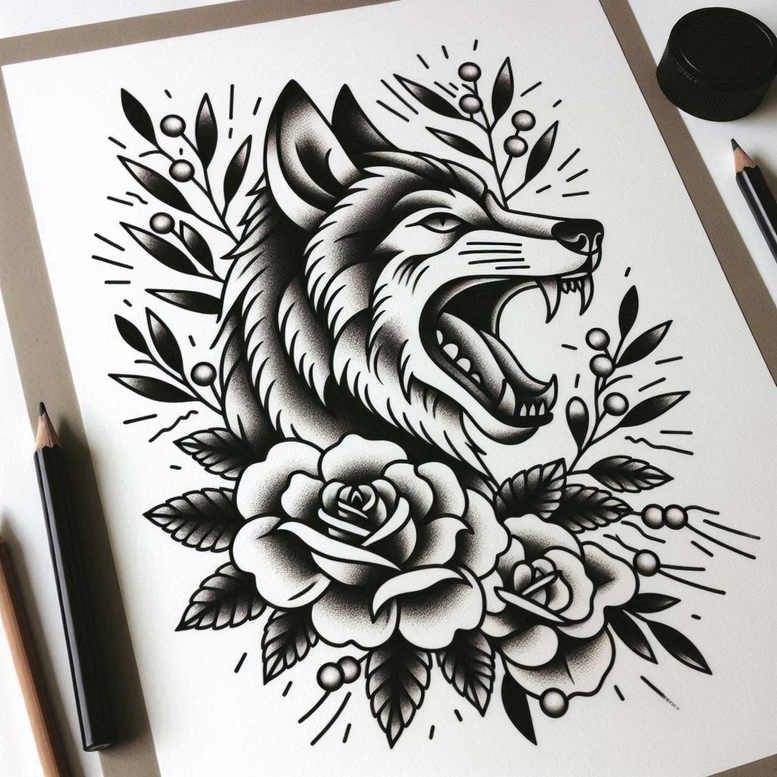 This tattoo design presents a powerful black and grey composition: a snarling wolf head emerging from a bouquet of roses, framed by leaves and light bursts. Executed in bold linework with smooth gradient shading, the portrait-like wolf displays open jaws and alert ears, while the roses provide a contrasting softness that balances aggression with beauty. The piece reads as a cohesive graphic pattern: interlacing stems and petals weave around the canine figure, creating negative space that enhances legibility when inked on skin. This is an AI-generated tattoo project exploring high-contrast motifs suitable for bold statements or as a cover-up option depending on placement. The imagery communicates strength, loyalty, and renewal; the wolf as a guardian, the roses as life’s fleeting beauty, and the surrounding foliage as growth and resilience. The design favors compact areas like the upper arm, back of the shoulder, or calf, where solid blacks and crisp lines translate well. In terms of technique, the artist would use clean black ink with smooth shading, employing stippling or cross-hatching sparingly for texture, while preserving strong outline fidelity. From a symbolism standpoint, the wolf’s gaze and open maw convey ferocity and protection, while roses symbolize love and transformation; the combination speaks to a meaningful tattoo design that can be customized in scale or detail to suit personal narratives. For collectors and clients seeking a traditional yet contemporary impact, this black and grey linework piece demonstrates how graphic patterns and floral elements can co-exist within a single tattoo design, reinforcing the timeless appeal of flower tattoos and animal motifs in modern body art.