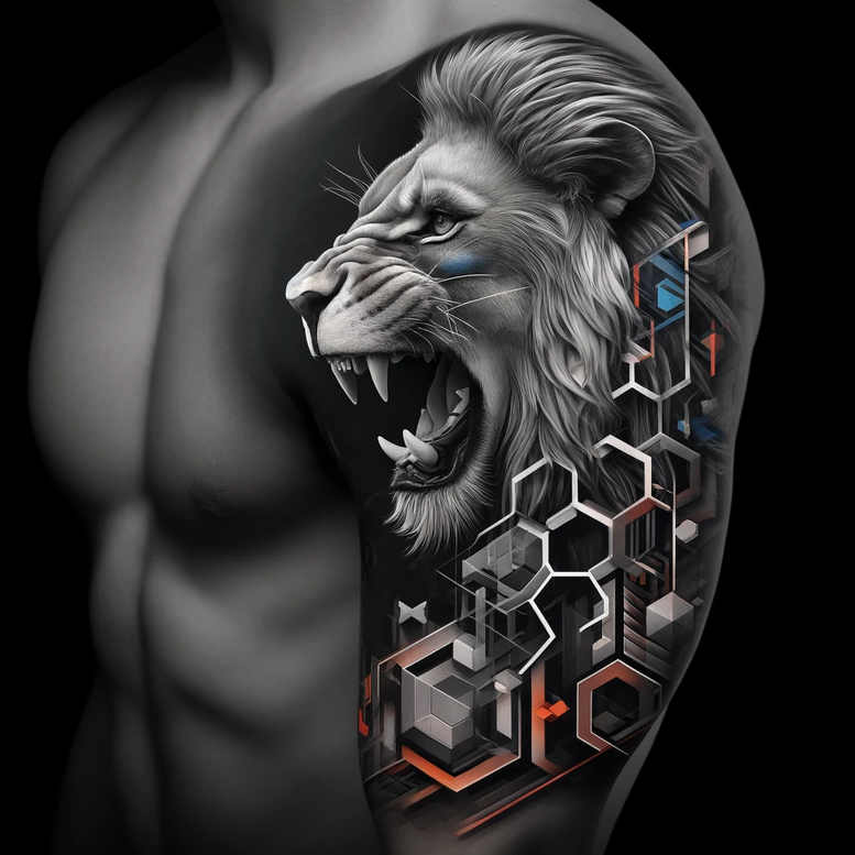 An audacious fusion of realism and geometry, this tattoo concept places a lifelike roaring lion on the shoulder and upper arm, while a lattice of hexagons and interlocking cubes threads along the forearm. The lion is rendered in black and grey with meticulous tonal shading that defines the mane, fangs, and expression, producing a lifelike focal point that reads as a statue-like presence on the skin. Surrounding geometry is executed with precise line work and faceted planes, creating depth and motion as the shapes cascade from the shoulder toward the elbow; the interplay of fur texture and hard-edged geometry establishes a modern body art statement. The composition uses negative space to enhance three-dimensionality, ensuring a bold silhouette while allowing room for adjustment when transitioning into a cover-up by increasing density or extending the geometric panel to conceal older ink. The color palette remains monochrome to emphasize contrast, shading, and form, though elements of color could be introduced later if desired. Symbolically, the lion stands for courage, leadership, and protection, while the geometric grid suggests structure, connectivity, and the intersection of nature and technology—themes popular in meaningful tattoos and custom tattoo design. Technique-wise, this piece blends realism with crisp geometry and allows for fine line tattoo detailing within the mane and along the polygonal lines, enabling a durable, timeless look on black and grey skin. As an AI-generated tattoo project, the concept illustrates how algorithmic design can yield cohesive tattoo art that remains legible from a distance and reveals intricate tessellations up close, making it a compelling template for full-sleeve or cap-sleeve work and a strong addition to any portfolio; it also offers potential to tailor to Japanese style tattoo influences or botanical motifs like lotus flower tattoo design, infinity tattoo, tribal tattoo, rose tattoo design, small tattoos, flower tattoos, and other custom tattoo design ideas while staying within the black and grey spectrum and embracing the new wave of geometric realism in tattooing.