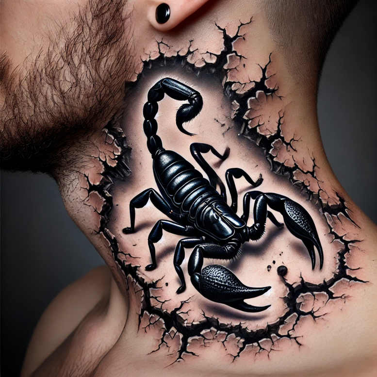 This AI-generated tattoo project presents a hyper-realistic black scorpion anchored to the neck, emerging from a jagged halo of cracked skin that appears to peel away from the surface. The design uses precise shading to give the exoskeleton a lifelike sheen, with crisp edges on the carapace, curved tail, and raised claws, while the surrounding fracture lines create a convincing sense of depth. The composition relies on black and grey tones to maximize contrast against the skin, with subtle highlights that mimic reflected light on the polished surface of the scorpion. The cracked skin acts as a dramatic backdrop, adding motion and tension without distracting from the central motif, and the negative space around the limbs ensures legibility even at a small tattoo size. Symbolically, scorpions stand for resilience, protection, and the idea of hidden strength; pairing the creature with a shattered epidermis motif can signify breaking free from limits or unveiling a latent power, making the work meaningful for clients seeking a bold, personal statement. In the context of tattoo design, this piece demonstrates expert control of realism within a compact canvas, combining dense black shading with precise linework to render a convincing tri-dimensional form that reads strongly in both black-and-grey and near-skin lighting conditions. The dark, cover-up-ready tones make it an ideal project for concealing older ink beneath a new, striking image while maintaining the integrity of the surrounding skin texture. The piece aligns with current trends in tattoo design and body art, appealing to enthusiasts of meaningful tattoos and black and grey realism, and it integrates widely searched keywords such as tattoo, tattoo design, meaningful tattoos, fine line tattoo, lotus flower tattoo, infinity tattoo, tribal tattoo, rose tattoo design, small tattoos, flower tattoos, custom tattoo design, Japanese style tattoo, black and grey, realistic tattoo, ink. For readers and clients, this AI-generated tattoo project combines technical prowess with symbolic depth, offering a compelling cover-up option that still reads as a powerful, standalone piece when viewed up close.