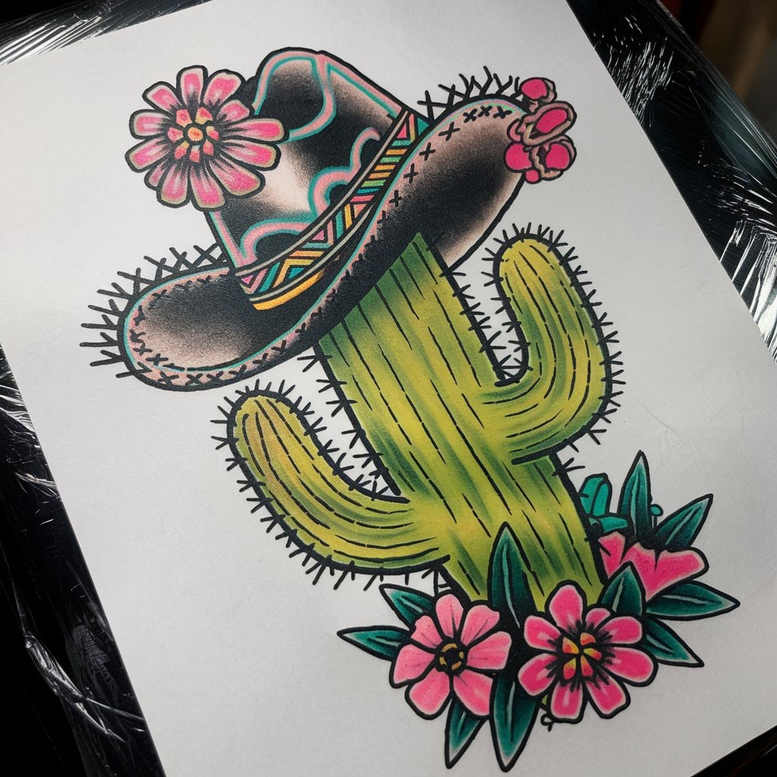 This tattoo concept presents a bold, color-forward interpretation of a desert motif rendered in classic American traditional style. The central figure is a sturdy green cactus, its tall arm showing vertical ribbing and dark spines along the edges, brought to life with saturated greens and subtle yellow-green highlights that suggest texture and sunlit surfaces. Perched atop the cactus is a wide-brimmed cowboy hat, drawn with black solid outlines and teal accents, its hatband executed with simple color blocks to preserve legibility at typical tattoo sizes. At the base, a cluster of pink five-petaled flowers with deep green leaves provides contrast and balance, creating a lively composition where nature intersects Western iconography. The design relies on strong, clean line work and bold color fills to achieve the unmistakable readability of traditional tattooing, ensuring visibility on skin from a distance while remaining crisp in smaller scales. Yoked together, the cactus, hat and blossoms tell a story of resilience, adventure, and growth: the cactus enduring drought and rough terrain, the hat invoking journeys and frontier symbolism, and the flowers signaling renewal and beauty amid harsh environments. The color choices—bright lime greens, warm pinks, and a dark hat with turquoise accents—support a cheerful, retro vibe while maintaining clarity and longevity as a body art piece. Although this is presented as a finished tattoo design, it’s also a flexible blueprint for a custom tattoo design; as an AI-generated tattoo project, it showcases how digital ideation can inform traditional motifs for clients seeking meaningful tattoos in small to medium sizes. The composition is well suited to personal symbolism, and the concept can be adapted into black and grey if the client prefers a more muted aesthetic, or scaled for different body placements without losing its clear silhouette and impact.