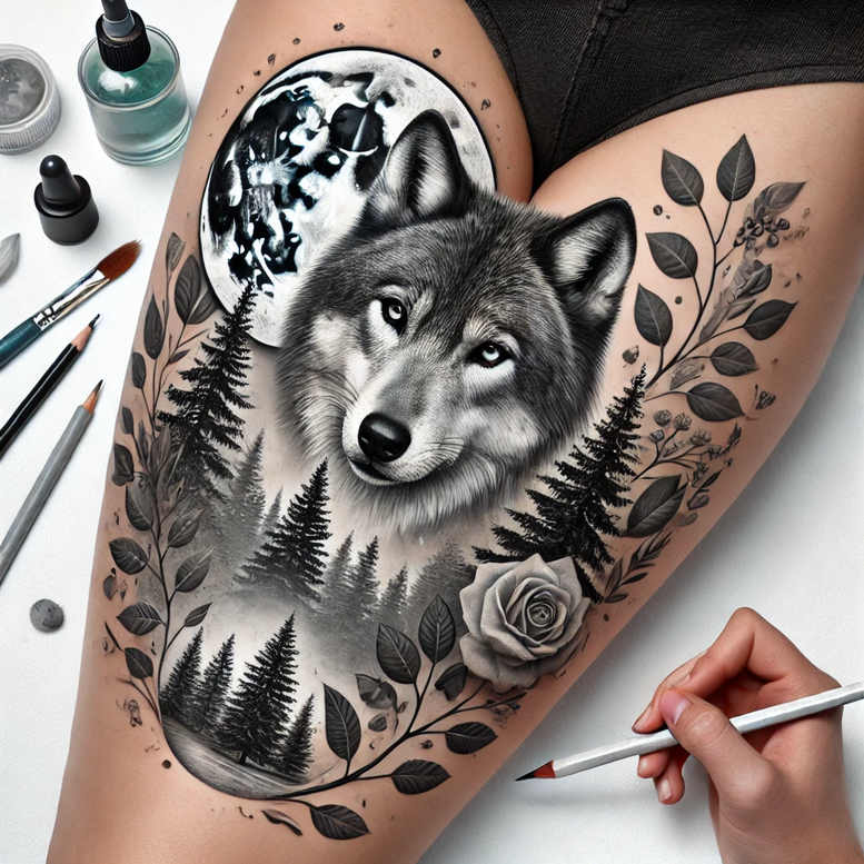 This AI-generated tattoo project concept is rendered in black and grey realism and centers a wolf head set against a nocturnal forest, with a full moon rising above serrated pine silhouettes and a rose framed by curling leaves. The wolf’s fur is built through layered shading and fine line work to achieve lifelike texture, while the trees rely on crisp, slender lines to convey depth and atmosphere. The moon behind the figure provides a luminous halo that heightens contrast and mood, inviting a narrative of guardianship and guidance through darkness. Leaves and branches weave around the main image, forming a natural frame that draws the eye toward the rose at the lower edge—a symbol of beauty, renewal, and resilience. The design suits thigh placement, offering a graceful arc that can scale for a dramatic sleeve-like piece or stay compact for a more contained tattoo. Dense shading and solid silhouettes give the composition immediate impact and make it a strong cover-up option for older work, without sacrificing foreground detail. As a meaningful tattoo concept, it blends wilderness motifs with floral elements to evoke loyalty, growth, and inner strength, while remaining adaptable to broader themes such as wildlife portraits, floral silhouettes, and nocturnal atmospheres. This piece is a modern take on classic realism, leveraging careful texture for fur, bark, leaves, and petals, and it can be tuned in line weight and shading density to suit skin type and aging. It also acknowledges its AI-origin as an innovative starting point for tattoo projects, offering a template that can be refined into a personal custom tattoo design and ink-ready artwork that resonates as meaningful tattoos in black and grey realism, body art, and beyond.
