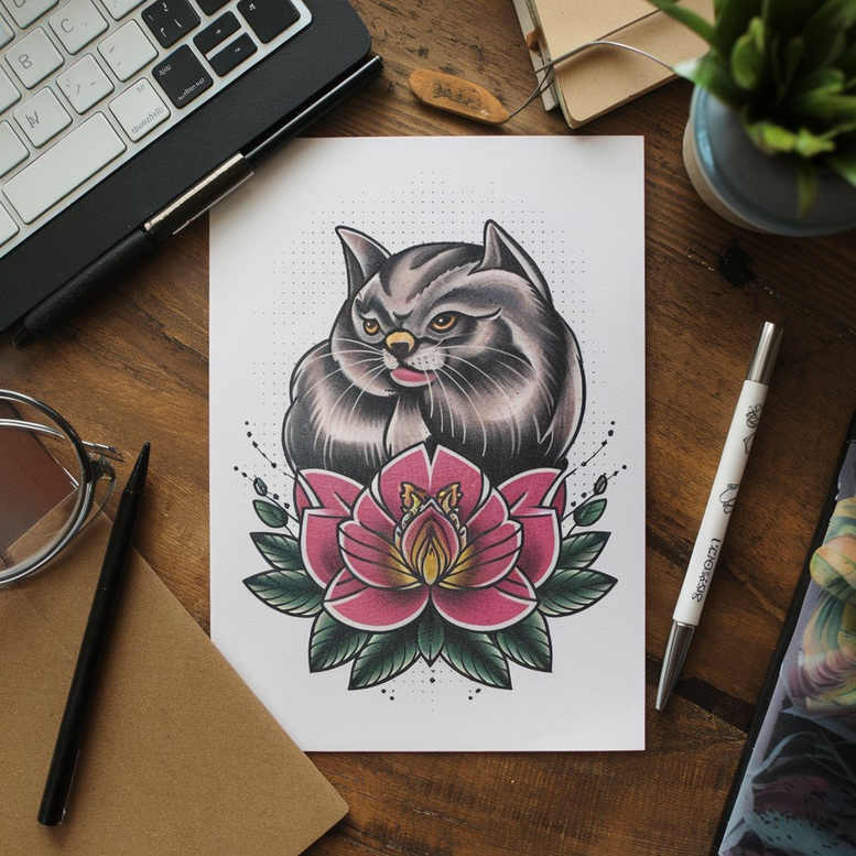 An AI-generated tattoo project concept presenting a cat perched above a lotus bloom, rendered with bold black outlines and layered color. The central image anchors a grayscale cat with subtle shading and amber eyes, contrasted by a lotus blossom in saturated pinks and soft yellows, flanked by deep green leaves. The composition remains clean and legible, designed to translate well to both small and larger placements. The lotus symbolizes purity, spiritual awakening, and new beginnings, while the cat conveys independence, curiosity, and protection; together they offer a meaningful tattoo design about balance and restraint. The technique emphasizes crisp line work, smooth color gradients, and careful contrast to maintain readability on skin, a hallmark of fine line tattoo aesthetics yet fully capable of a realistic tattoo feel when scaled. The petals are arranged in a radiating, pattern-like formation, inviting pattern detailing in background or sleeve work, and the dotted accents around the composition add texture without overpowering the main figure. While rooted in traditional tattoo sensibilities, the concept embraces modern color theory: vibrant pinks, fresh greens, muted grayscale, and controlled highlights to preserve depth. This concept is adaptable to a variety of styles, from black and grey with selective color to full-color realism, and can be tailored to preferences such as Japanese-style influence, tribal line accents, or rose tattoo design flourishes. If used as a cover-up, the bold lotus and cat motif offers strong coverage potential with solid negative space to obscure previous work. As an AI-generated tattoo project, it demonstrates how digital design can inform and accelerate custom tattoo design processes for clients seeking meaningful tattoos, small tattoos, or statement pieces, while integrating SEO-friendly terms including tattoo, tattoo design, meaningful tattoos, fine line tattoo, lotus flower tattoo, infinity tattoo, tribal tattoo, rose tattoo design, small tattoos, flower tattoos, custom tattoo design, Japanese style tattoo, black and grey, realistic tattoo, body art, ink.