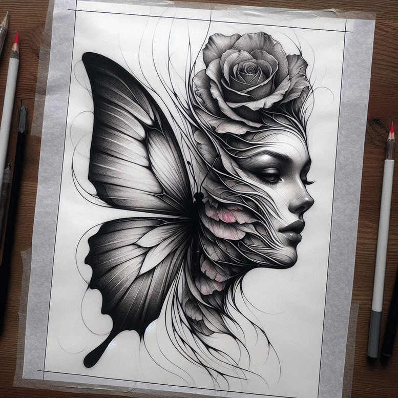 An AI-generated tattoo project concept presented in black-and-grey realism, this piece centers on a refined female portrait merging with butterfly wings. The core motif places a calm profile in bold relief, its features shaped with smooth gradients and delicate shading that convey introspection. Behind and around the head, butterfly wings unfold in layered panels, with veined, scale-like textures and sweeping lines that read as graphic, pattern-rich elements when committed to skin. A rose crown sits atop the brow, petals curling toward the temple and echoing the hair’s flowing lines, unifying floral and insect motifs into a single narrative. The linework is fluid and kinetic, built from sweeping curves and fine lines that suggest motion as the portrait dissolves into nature. Shading remains predominantly black and grey, delivering strong contrast and a semi-realistic feel while preserving the tattoo-friendly balance between bold areas and negative space. The technique leans into contemporary fine-line aesthetics married to detailed realism, making it suitable for meaningful tattoos with themes of transformation, beauty, resilience, and metamorphosis. The graphic pattern in the wings and the threadlike tendrils create a rhythmic texture that translates well to placement on the shoulder, back, or thigh. Because the design uses dense blacks and intricate linework, it also serves as an excellent cover-up concept for concealing older ink while maintaining legibility at a distance and up close. As an AI-generated project, it demonstrates how digital concepts can inform traditional tattoo design, offering a versatile blueprint that can be adapted to smaller scales or adjusted with Japanese-style shading touches within a black-and-grey palette. This tattoo design invites personal meaning—strength, renewal, and the fusion of human form with nature—while staying true to professional standards of line precision, contrast, and enduring body art appeal.