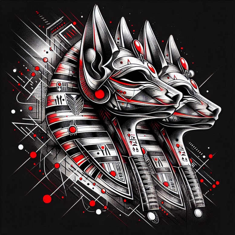 Anubis-inspired tattoo gallery entry presents a bold black and grey composition rooted in ancient myth and executed with contemporary linework. The central image is a stylized jackal head drawn with crisp geometric shapes, interlocking angles, and deliberate negative space that creates a modern, almost architectural silhouette. Surrounding elements echo repeating patterns of lines and dots, generating a rhythm that guides the eye along the jawline and crown while maintaining clarity at typical tattoo scales. The symbolism is explicit: in Egyptian mythology Anubis, the jackal-headed god, protects the dead and presides over mummification and the journey to the afterlife; this piece therefore speaks to protection, guidance, and transformation. The geometric frame acts as a visual mandala around the deity, suggesting balance, order, and the cyclical nature of life and death — a meaningful tattoo design for anyone seeking a narrative, rather than a mere image. The use of solid blacks for negative space with restrained grey shading creates strong contrast, ensuring longevity and legibility on the skin. Because the design leans into heavy black areas, it is particularly suitable as a cover-up piece for older tattoos or blemishes, a point reinforced by its dense shadows and broad shapes; the user can opt to scale the black areas to match a specific cover-up goal. This AI-generated concept blends traditional iconography with contemporary tattoo design trends, offering a versatile option for shoulder, chest, or back placements and adaptable sizing without losing the impact of the geometric rhythm. In practice, the piece invites personalization: line weights can be varied for a softer or more aggressive feel, red accents can be added for focal emphasis, or the pattern density adjusted to suit the wearer’s preferences. Overall, the fusion of Anubis symbolism with geometric linework yields a powerful body art statement that is both meaningful and visually arresting, making it an excellent choice for collectors of meaningful tattoos looking for a standout black and grey piece.