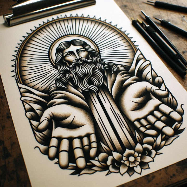 This piece belongs to a tattoo gallery inspired by the figure of the One God YAHWEH, translating a sacred idea into a contemporary line-work study. The composition centers on a bearded, robed male form, his hands outstretched in blessing, framed by a radiant halo that erupts into a dense field of sunburst rays. The iconography uses a bold black-and-grey palette, with crisp negative space defining the figure’s silhouette and the deep folds of the robe, while soft grey gradients render depth in the beard, face, and cuffs. A circular floral motif anchors the base, providing balance to the verticality of the figure and the geometric rhythm of the rays. The repeating sunray motif creates a patterned field that adds unity and cadence to the tattoo design, reinforcing its meditative, devotional mood. The overall effect is graphic yet reverent, balancing traditional religious symbolism with contemporary tattoo aesthetics. This design embraces ink as a sculptural medium, exploiting high-contrast areas for impact while preserving subtle transitions that read clearly from distance and up close. The interplay of light and shadow, together with the circle motif and hand gesture, communicates themes of mercy, authority, and protection that many seekers translate into meaningful tattoos. The concept is AI-generated, illustrating how sacred subjects can be reimagined in a controlled studio environment. No image can depict the true image of God; all designs are symbolic, artistic interpretations of His essence, not a real representation. Within the One God YAHWEH gallery this piece is presented as a project/idea, particularly suitable for cover-up due to its dense blacks and bold silhouette, with the patterning offering potential for adjustments in scale and shading. The repeating motif invites contemplation and makes this design adaptable for various body placements, while maintaining a strong, iconic identity as a black-and-grey tattoo. In sum, this tattoo design stands as a powerful fusion of faith and ink, embodying meaning, craftsmanship, and the timeless appeal of body art in contemporary culture.