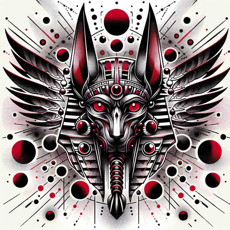 This piece is a tattoo concept inspired by Anubis, the jackal-headed guardian of the Egyptian underworld, rendered as a winged mask with a mechanized, geometric aesthetic. The central head is sculpted in bold lines with high-contrast black ink, while metallic greys create a sense of chrome plating and depth. Behind the mask, paired wings unfurl with feathered detailing that blends traditional linework with angular facets, producing a dynamic silhouette suitable for large canvases on the back or chest. Red orbs punctuate the forehead and cheeks, offering a vivid contrast that draws the eye and hints at life force and ceremonial energy. The composition relies on bold outlines, meticulous fine line work, and strategic negative space to maintain readability as it ages on the skin. This is a dark, dense tattoo; for wearers seeking a statement piece, the black and grey palette ensures longevity, while the dotwork and repeating circular motifs introduce a subtle pattern that enriches texture without compromising clarity. The symbolism is rich: Anubis as guardian and guide of souls, wings symbolizing ascent and protection, and the red orbs suggesting vitality and ceremonial energy. The piece embodies transformation, mortality, and protection—timeless themes that fit meaningful tattoos across cultures. The design nods to modern tattoo aesthetics, merging neo-tribal geometry with a cinematic, sci-fi edge, which makes it highly adaptable to large surfaces. While this concept benefits from professional interpretation, it remains accessible as a custom tattoo design that can be tuned to different body contours. AI-generated concept notes appear here, emphasizing the emerging technology behind concept exploration; the image as shown could be translated into a high-detail commission that respects anatomy, flow, and skin tone. If you are exploring a cover-up, the dense black shading can effectively mask previous work, and the repeating pattern elements provide a cohesive transition into new artwork. For those seeking a perfect cover-up, this Anubis-inspired design offers a bold, high-contrast silhouette with enduring symbolism that remains legible over time. In sum, this design is more than a tattoo—it is a narrative in ink about ancient guardianship and modern artistry.
