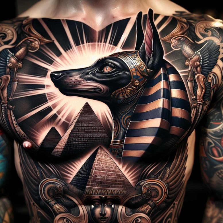 This tattoo gallery is inspired by Anubis from Egyptian mythology, and the chest composition pairs a jackal-headed deity with sacred geometry to convey protection, transition, and rebirth. The jackal wears a striped nemes headdress, rendered in a bold black and grey palette that emphasizes form and shadow, while beneath it sits a compact landscape of pyramids that symbolize eternity, stability, and royal power. A radiant sunburst rises behind the figures, creating a halo of light that suggests illumination in darkness and the enduring cycle of life and afterlife. The overall design fuses ancient symbolism with contemporary tattoo storytelling, making it a meaningful tattoo design for someone drawn to Egyptian mythology. The careful interplay of negative space and dense shading yields a dramatic contrast that reads clearly from a distance and remains legible up close, a hallmark of high-contrast realism in black and grey tattoo art. The repeating rays and lines in the headdress and sun motif establish a subtle pattern that guides the eye along the chest, enhancing flow with the body’s natural contours while giving the piece a rhythmic cadence. As a chest piece, the composition balances a strong central axis with outward spread, inviting potential extensions into shoulder or sternum areas if desired. This design embraces a disciplined realism while preserving bold silhouette clarity, ensuring longevity as the skin ages and the ink settles. It honors ritual meaning as a protective guardian, a guide through transition, and a reminder of the cycle of renewal; the pyramids anchor mortality and memory, while the sunburst embodies enlightenment and regeneration. The work sits firmly in the broader tradition of classic Egyptian-inspired tattoo art, yet remains unmistakably contemporary in its shading, line work, and composition. There is a deliberate choice of black ink over full color to maintain drama and timelessness, making it suitable for a wide audience seeking meaningful tattoos that age gracefully. It is also a design concept crafted for an AI-assisted workflow, highlighting how digital planning can inform traditional tattoo aesthetics; note that the final piece will be refined by a tattoo artist to ensure precise line integrity and skin compatibility. Additionally, this heavily shaded, near-60% black field makes it perfect for cover-up, capable of transforming older scars or tattoos into a powerful new narrative with strong, lasting impact.