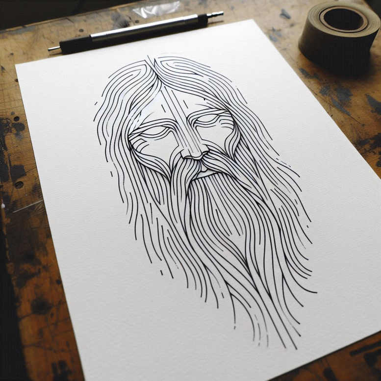 One God YAHWEH-inspired composition rendered as a black and grey fine line tattoo concept, this piece foregrounds a bearded, solemn face with elongated, flowing hair that dissolves into negative space. The composition relies on delicate line work, subtle cross-hatching, and rhythmical contours to convey reverence and mystery while remaining suitable for a tattoo design. The central face is stylized rather than realistic, with softened features and a gentle, almost monastic gravity. The use of white space around the figure enhances contrast and gives a sense of transcendence, while the beard and hair extend downward in fluid, almost calligraphic lines that suggest movement and breath. This design embraces symbolic interpretation rather than literal depiction, aligning with the idea that no image can depict the true image of God — all designs are only symbolic, artistic interpretations of His essence, not a real representation. As part of a broader series inspired by the One God YAHWEH, this concept evokes timeless spirituality and the quest for meaning through ink. The artwork resembles a fine line tattoo schematic, with careful attention to line weight, spacing, and composition to ensure clarity on skin. If printed or tattooed as a cover-up, the dark values could be leveraged with stronger shading to preserve the original intent, though this piece is primarily a line drawing. Occasionally, AI-generated concepts inform the initial sketch, offering a fusion of algorithmic precision with human artistry. The design emphasizes meaningful tattoos, black and grey aesthetics, and the longevity of a simple, elegant silhouette suitable for both new tattoos and small tattoos collections. The approach balances sacred symbolism with contemporary minimalism, inviting interpretation while maintaining legibility from a distance. This narrative-friendly style aligns with modern tattoo design trends, underlining the enduring appeal of spiritual and mythic motifs rendered in restrained line work, suitable for body art enthusiasts seeking a refined, contemplative small or medium tattoo.