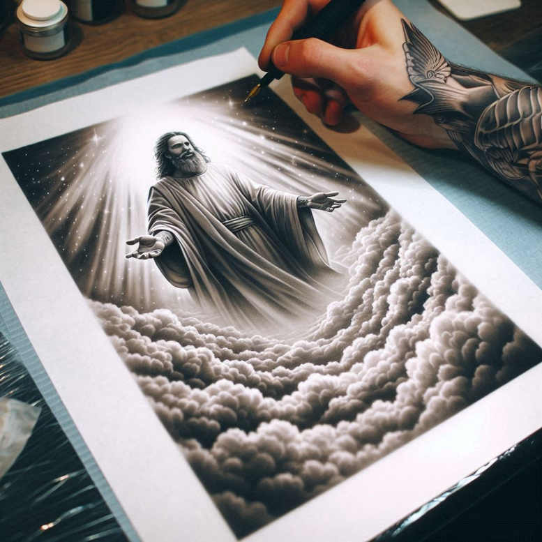 This tattoo gallery entry is inspired by the figure of the One God YAHWEH and presents a grayscale concept suitable for chest, back, or shoulder work. A central robed silhouette rises above curling cloud forms, crowned by a shaft of celestial light that seems to descend from above the frame. The composition relies on black and grey shading, with fine line work defining the garment, the folds, and the emanating rays, while negative space carves out a sense of breath and vast sky. The robe flows with a quiet gravity, rendering a timeless reverence that harmonizes with modern tattoo design language. The surrounding clouds anchor the figure in an ethereal, cosmic setting; the interplay of light and shadow evokes themes of revelation, protection, and divine presence, while remaining clearly symbolic rather than literal. The design intent is to offer a versatile tattoo design that can adapt to different body contours, with careful planning of scale, line weight, and shading to preserve legibility over time. This entry embraces a contemporary aesthetic while honoring sacred iconography, appealing to seekers of meaningful tattoos, fine line tattoo lovers, and those drawn to black and grey, realistic tattoo approaches. The text intentionally acknowledges that no image can depict the true image of God; all designs are symbolic, artistic interpretations of His essence, not a real representation, a reminder that reverence remains essential when translating sacred ideas into body art. The artwork is an AI-generated concept offered for exploration, inviting dialogue about symbolism and personal meaning within a respectful frame, and presents a clean, print-ready reference for clients and artists alike. As a gallery concept, it emphasizes the power of minimalism, restraint, and composition in tattoo design, inviting dialogue about faith, art, and the body as a canvas for divinity while maintaining sensitivity to religious contexts. In short, the piece offers a timeless, adaptable blueprint for a meaningful tattoo that honors the One God YAHWEH without literal depiction, balancing spirituality with craft and user interpretation.