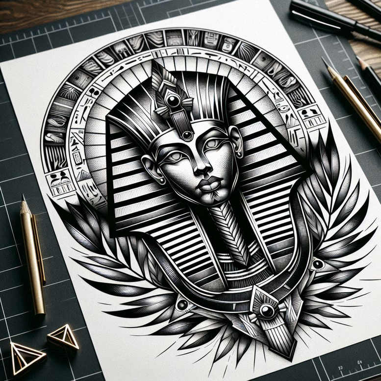 This AI-generated tattoo project presents an Egyptian pharaoh motif rendered in crisp black and grey line-work. The central portrait is framed by a nemes headband whose bold stripes radiate outward, creating a striking sense of order and depth. Below, a broad collar borrows from traditional Egyptian jewelry, its panels defined by fine lines and geometric shading that give the piece a sculptural feel. On either side, stylized feathers and leaf motifs extend outward, providing movement and balance while playing with negative space. The composition relies on high-contrast shading, with smooth gradients that keep the image legible at different sizes. The design reads as a bold statement tattoo design, suitable for large forearms or upper arms, chests, or backs where the geometry can breathe. The black and grey ink emphasizes texture and form rather than color, favoring cross-hatching, stippling, and crisp line work to convey shading and depth. The symbolism ties to ancient guardianship and endurance, with the pharaoh representing authority and permanence, while the patterned surrounding elements reference protection and continuity. From a tattoo design perspective, this piece demonstrates how fine line tattoo techniques can render intricate regalia with clarity: the stripes of the headdress, the layered collar plates, and the etched feather motifs all stand up to aging when executed with careful line weight. For collectors seeking meaningful tattoos, the work offers a timeless look that can be tailored in scale—whether as a compact emblem or a sprawling centerpiece—without losing the stark clarity of black and grey ink. In short, this is a bold, pattern-driven study in Egyptian iconography that embodies classic body art: a strong silhouette, meticulous line work, and enduring symbolism. Careful attention to line weight ensures consistency across scales, making it viable for sleeves or torso work. The piece invites personalization in motif density and scale while maintaining a timeless, monochrome elegance. Note: AI-generated tattoo project.