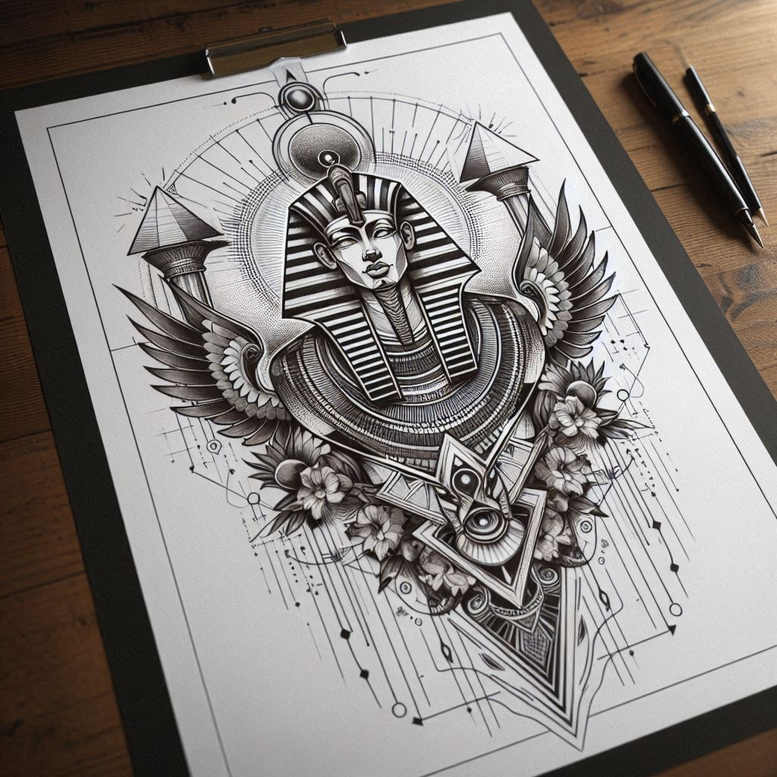 This Horus-inspired tattoo design in black and grey art draws from the ancient Egyptian god Horus, guardian of the sky and ruler’s protection, infusing the Eye of Horus with a contemporary geometric sensibility. The central motif is the Eye of Horus, enclosed in a circular medallion that anchors the composition, while a falcon-headed silhouette suggests Horus in flight, its wings extending outward in symmetrical arcs that frame a pyramid-inspired base and a lattice of triangles and diamonds. The piece is executed with a fine-line technique that yields crisp contours and delicate shading, producing a tattoo with exquisite detail and a modern edge. The outward geometry is punctuated by a circle and intricate linework that echoes sacred geometry, serving as a contemporary interpretation of ancient symbols. The repetition of triangular motifs and intersecting lines creates a hypnotic pattern that anchors the visual weight toward the central eye and the horizon of the wings, reinforcing themes of perception, protection, and rebirth. The Eye of Horus stands as a talisman for healing, protection, and good fortune; here it translates into a wearable emblem that can anchor a larger canvas on the upper arm, chest, or back, with space for additional elements if desired. Because the piece leans toward black and grey shading with dense black accents, it is well-suited for a cover-up, especially on darker skin tones, where the strong lines and negative space can conceal prior work while maintaining legibility of the new design. This Horus-inspired concept offers meaningful tattoo symbolism—strength, heritage, and vigilance—woven into a geometric, contemporary aesthetic that resonates with those seeking a tattoo design that fuses ancient meaning with modern technique. The composition illustrates balance between timeless myth and current ink craft, delivering a bold statement in a single, versatile tattoo design that can be adapted for placement on the chest, back, or sleeve, and expanded with hieroglyphic motifs if desired. In essence, this design is a testament to how Egyptian symbolism can be reinterpreted through precise linework and a black and grey palette to create a lasting, meaningful tattoo.