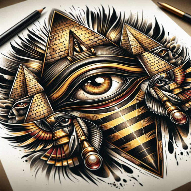 An AI-generated tattoo project concept featuring a central, watchful eye framed by intersecting pyramids and winged accents, rendered in a disciplined geometric style with bold black lines and warm gold highlights. The composition juxtaposes three-dimensional pyramidal forms against flowing feather motifs, creating a dynamic tension between sharp geometry and organic motion. The eye acts as a focal point, suggesting perception, vigilance, and insight, while the surrounding pyramids nod to ancient symbolism and the pursuit of hidden knowledge. Each element is carefully engineered with precise linework and nuanced shading to achieve a commanding visual impact that remains legible at both large canvases and smaller scales. The wings unfold outward, their layered feathers forming a radiating cadence that guides the viewer’s gaze toward the center, while gold accents bring warmth and a touch of luxury to an otherwise monochrome palette. The design’s density and contrast make it particularly well-suited for a bold statement piece on the upper arm, back, or chest, and its strong outlines and shading are conducive to a striking cover-up if required. From a technical perspective, the piece balances high-contrast black ink with selective metallic highlights, employing smooth gradient fills to render feather textures and the brick-like pattern on the pyramids. The overall effect marries modern graphic geometry with timeless symbolism, offering a scalable motif that can be adapted to the wearer’s size, placement, and skin tone. For clients seeking meaning in ink, the concept resonates with protection, perception, and intellectual curiosity, while providing flexibility in rendition—from black and grey to full-color ink depending on preferences. As an AI-driven tattoo project concept, it demonstrates how computational design can yield cohesive, market-ready ideas aligned with current tattoo trends, including geometric patterns, pattern-centric work, and hints of Japanese-inspired architectural balance. In practical terms, artists can dial iris shading, modulate gold saturation, or simplify pyramidal forms for a more minimalist interpretation, ensuring readability and aesthetic coherence across sizes. This description highlights the tattoo’s potential as a bespoke piece that blends symbolism and graphic precision, ideal for individuals exploring meaningful tattoos and refined ink artistry, and its existence within a broader conversation about AI-assisted creativity in the tattoo industry.