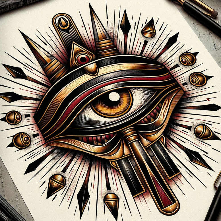 An AI-generated tattoo project concept presenting a geometric eye burst built from layered bands, sharp spikes, and radiating lines. The central eye is detailed with a bright amber iris and concentric shading, while surrounding bands curve and fold like metallic ribbons, creating a sense of motion and depth. Dagger-like blades and angular shards punctuate the composition, and small orbs scattered on the periphery echo rivets, giving the piece a bold graphic rhythm. The design relies on strong black line work combined with smooth gradient shading and selective gold highlights that catch the light in skin, producing a striking contrast between black and grey values and warm metallic accents. The overall pattern of interlocking shapes reads like a modern graphic tattoo while nodding to traditional Japanese style tattoo motifs and classic geometric tattoo design language. This tattoo design embodies themes of perception, protection, and insight, making it a meaningful tattoo design choice for someone seeking a statement piece with symbolism. It can be inked as a large, high-contrast piece on the arm, back, or chest, and its dense linework supports a durable, long-lasting result, while the bold rays and eye motif lend themselves to visibility and impact. If a cover-up is required, the density of the pattern and the dark tonal values help conceal underlying lines beneath, making it a potential cover-up option with careful planning. As an AI-generated concept, this project demonstrates how algorithms can generate innovative tattoo imagery that blends meaning with graphic precision, inviting personalization around themes like lotus flower tattoo or infinity tattoo as well as broader ideas in black and grey or full color ink. In practical terms, the design pairs well with a custom tattoo design workflow, combining fine line precision and large-scale composition to yield a timeless piece of body art, assured to remain legible and impactful as an enduring symbol of vision, strength, and resilience.
