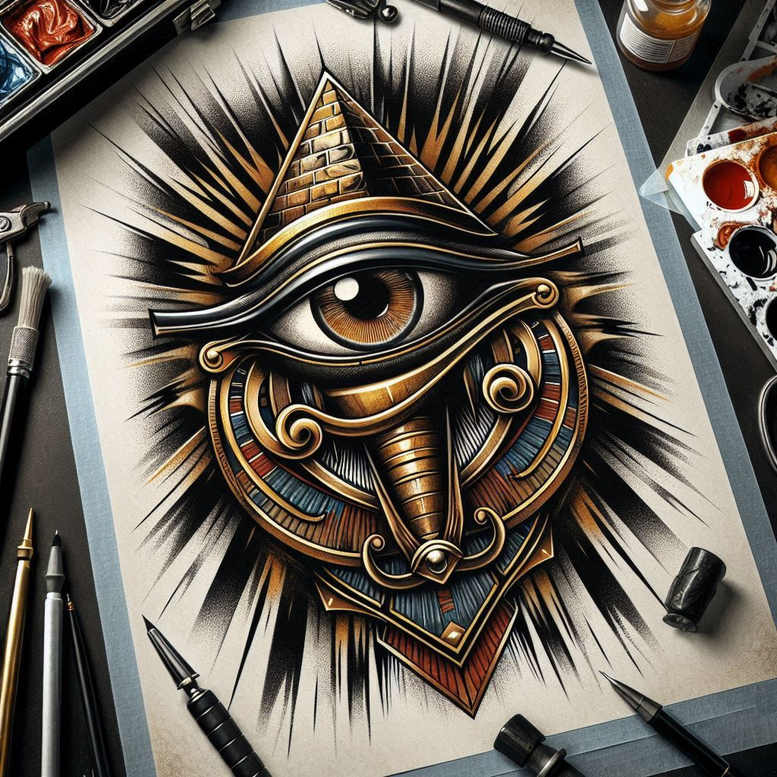 This AI-generated tattoo project presents a bold, geometry-driven motif: a central eye framed by a triangular pyramid top and a lattice of steampunk gear elements. The composition radiates outward with jagged line bursts, creating the impression of an explosive shell around a shield-like base. Crisp linework alternates with smooth curves, and heavy black shading builds depth, while metallic gold and blue accents emphasize mechanical facets. The eye is rendered with a lifelike iris and reflective gleam, the pyramid hints at ancient knowledge, and the gears symbolize industry and motion. Ribbons swirl and coil around mechanical components, intertwining with a decorative anchor-like piece; the whole design sits within a shield-shaped border that anchors the motif. The technique relies on bold black fill, cross-hatching, and gradient shading to achieve three-dimensional skin texture. The piece blends graphic geometric patterning with a steampunk aesthetic, delivering a tattoo design that feels both timeless and contemporary. This piece is intentionally dense with dark areas, making it an excellent candidate for a cover-up on larger canvases; solid blacks can obscure previous tattoos while negative space preserves readability. Meaningful tattoos often explore protection, perception, and transformation; here, the all-seeing eye within a pyramid connotes vigilance and hidden knowledge, while interlocking gears convey motion and persistence. For clients seeking a bold statement, this custom tattoo design offers versatile placement options—from the upper arm to the back—and works particularly well in black and grey with selective gold and blue accents that pop yet remain cohesive. This is an AI-generated tattoo project; it demonstrates how digital concepts translate into skin-ready art, balancing graphic patterns with painterly shading to create dramatic, enduring body art aligned with keywords such as tattoo, tattoo design, meaningful tattoos, fine line tattoo, black and grey, lotus flower tattoo, infinity tattoo, tribal tattoo, rose tattoo design, small tattoos, flower tattoos, custom tattoo design, Japanese style tattoo, realistic tattoo, and ink.