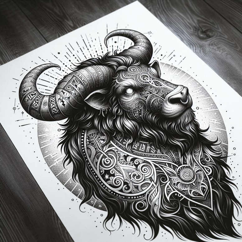 This black and grey tattoo design centers on a Minotaur bull head, an emblematic Greek myth figure, crafted with dense linework and meticulous shading that renders a lifelike, almost sculptural quality. The bull’s powerful horns curve above a helm-like crown of ornate armor, whose plates are etched with swirling filigree and geometric motifs. Behind the figure sits a circular mandala, a concentric halo that anchors the composition and adds spiritual resonance. The piece relies on a tight balance of solid blacks and smooth gray washes, with fine line details and dotwork that create depth and texture, giving the design a highly decorative, almost tapestry-like feel. Symbolically, the Minotaur conveys duality—strength and primal instinct yoked to rational will and endurance—while the labyrinth theme evokes inner journeys, decisions, and protection. The armor suggests a guardian role, a defender of boundaries, while the mandala foreground implies harmony and cyclical renewal. Repeating graphic patterns on the armor and within the mandala create a rhythmic cadence that draws the eye toward the center, reinforcing the idea of focus and discipline. This tattoo design is a strong choice for meaningful tattoos for those who want a powerful mythic reference in black and grey ink. The heavy darkness and dense shading yield a bold silhouette, making this piece perfectly suited for cover-up applications on older tattoos or skin tones that require solid correction, and it reads well in large scales as a realistic tattoo, while still maintaining a high level of craftsmanship and readability at smaller sizes. AI-generated concept elements are integrated through the symmetric composition and decorative motifs, contributing to a sophisticated, timeless body art piece that speaks to both contemporary and classical influences.