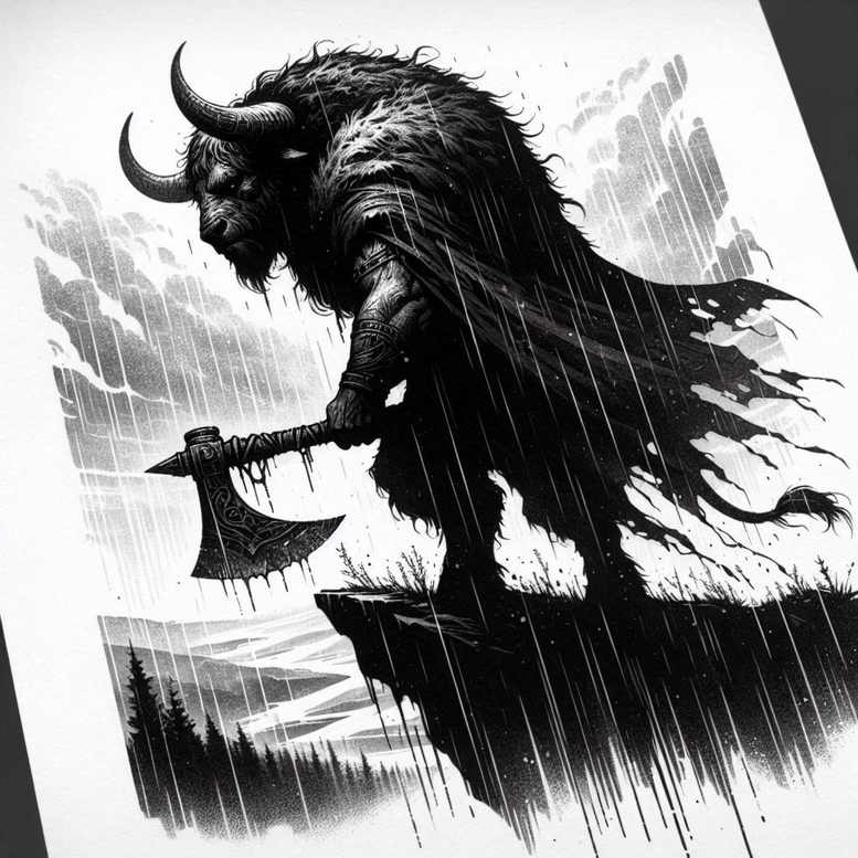 This AI-generated tattoo project presents a cover-up-ready, high-contrast black and grey illustration of a horned viking standing on a jagged cliff in a heavy rainstorm. The composition is built around a bold silhouette, crisp linework, and dense hatching that creates depth without sacrificing readability when applied large. The central figure grips a double-edged axe; horns sweep forward while a wind-driven cape billows behind, and a sparse pine forest anchors the lower edge. The rain streaks act as a graphic pattern that adds motion and texture, guiding the eye across the scene. The design relies on strong negative space and tonal variation to achieve a vigorous yet refined look that translates well to skin, making it a compelling option for a back, sleeve, or chest piece. The theme embodies resilience, conquest, and solitary strength; the storm setting subtly reinforces the idea of transformation through ink. From a technical standpoint, the piece emphasizes dense black ink, deliberate contrast, and controlled shading to render a lifelike yet stylized character within a mythic landscape. For clients seeking meaningful tattoos, this concept offers a dramatic narrative and a versatile cover-up solution for older, darker work, while still functioning as a stand-alone statement piece. As an AI-generated tattoo project, it demonstrates how digital concepts can inform traditional tattoo planning, with potential to tailor scaling, line weight, and pattern density to suit individual skin tones and anatomy.