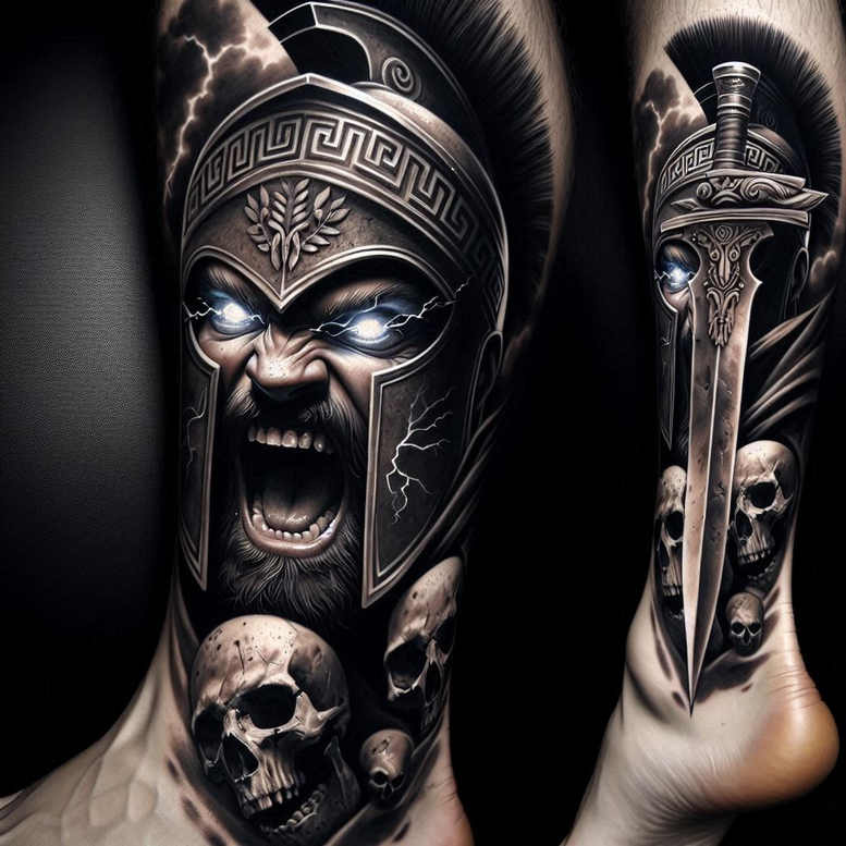 This black and grey leg tattoo presents a roaring armored warrior wearing an ornate helmet with a Greek-key band, his mouth open in a ferocious roar, and eyes illustrated with an almost supernatural glow. Down the calf, a cluster of skulls weaves into the composition, while a long dagger-like blade runs along the shin, its edge shaded to convey cold steel and menace. Lightning cracks around the helm amplify the drama, and the helmet itself features a bold ornamental pattern that adds depth and a classical resonance to the piece. The design relies on high-contrast shading, crisp linework, and layered textures to achieve a lifelike, three-dimensional feel, hallmarks of modern realism in black and grey ink. This is an AI-generated tattoo project, conceived with cover-up in mind: the dense black ink areas and deliberate negative spaces allow it to mask previous work while preserving a striking silhouette for a large leg canvas. The skulls introduce a mortality motif that contrasts with the warrior’s determination, while the dagger supplies vertical tension and a narrative of vigilance. Throughout, the piece melds graphic patterning with dynamic movement, creating a powerful statement tattoo suitable for a thigh or shin placement. For those seeking meaningful tattoos, the array of elements—warrior, helmet, skulls, sword, dagger, and lightning—offers rich symbolism around strength, resilience, and transformation. The technique favors black and grey realism, with selective fine-line accents to delineate features and textures, making it a compelling custom tattoo design for fans of Japanese-influenced or contemporary realist body art, inked with precision for longevity and impact. This cover-up-ready, pattern-heavy composition invites refinement in consultation to tailor skin tone, line density, and scaling, delivering a dramatic, high-contrast tattoo design with enduring visual power.