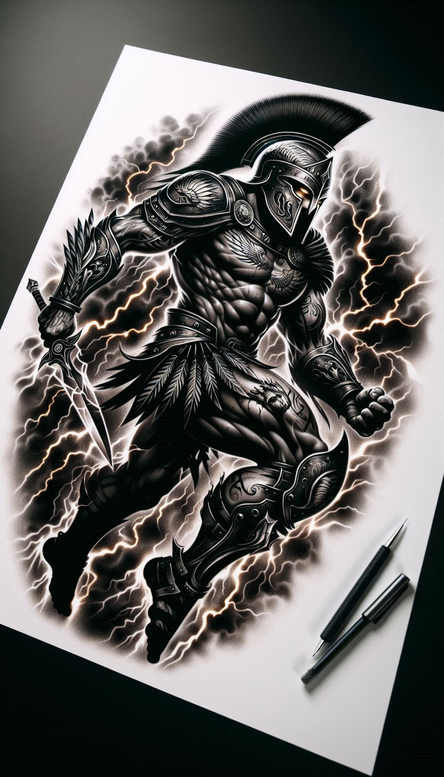 An imposing black-and-grey tattoo concept rendered as a hyper-detailed illustration of a knight in ornate armor. The central figure strides forward with a sharp, gleaming sword, a helmet crowned by a plume, and layered breastplate, gauntlets, and greaves featuring filigree and texture that mimic real ink on skin. Surrounding the warrior, jagged bolts of lightning carve the negative space, creating a dramatic contrast against solid shadows and soft highlights. The composition emphasizes strong silhouettes, crisp linework, and smooth gradient shading to achieve a realistic tattoo design that reads well at multiple scales. The armor is intentionally embossed with engravings that hint at ancient myths, while the dynamic pose and wind-blown plume convey motion and resilience. This piece is ideal for someone seeking a bold, cover-up-friendly design that can mask existing imagery beneath the dark, high-contrast forms. The aesthetic leans toward black and grey realism, with careful attention to anatomy, muscle definition, and texture on leather, steel, and cloth. Patterned detailing on the armor creates a sense of pattern within the design, reinforcing visual complexity without sacrificing readability as a tattoo. As an AI-generated tattoo project, this concept demonstrates how digital artistry can translate into a powerful body art idea, suitable for a back piece, chest panel, or sleeve. For customization, the motifs can be swapped to reflect personal guardianship or combat lineage, while preserving the overall mood of strength and protection. In the broader context of tattoo culture, it aligns with meaningful tattoos that celebrate resilience, courage, and identity, while remaining adaptable to different body contours and sizes. The design integrates influences from Japanese style tattoo aesthetics and modern realism, ensuring compatibility with a variety of skin tones and ink densities. While rooted in realism, it can be adapted into a fine line tattoo approach for subtler variants, maintaining the essence of the dark, dramatic knight. This piece speaks to the enduring appeal of black and grey ink—an iconic, cover-up-ready hero that can become the centerpiece of a larger body-art narrative.