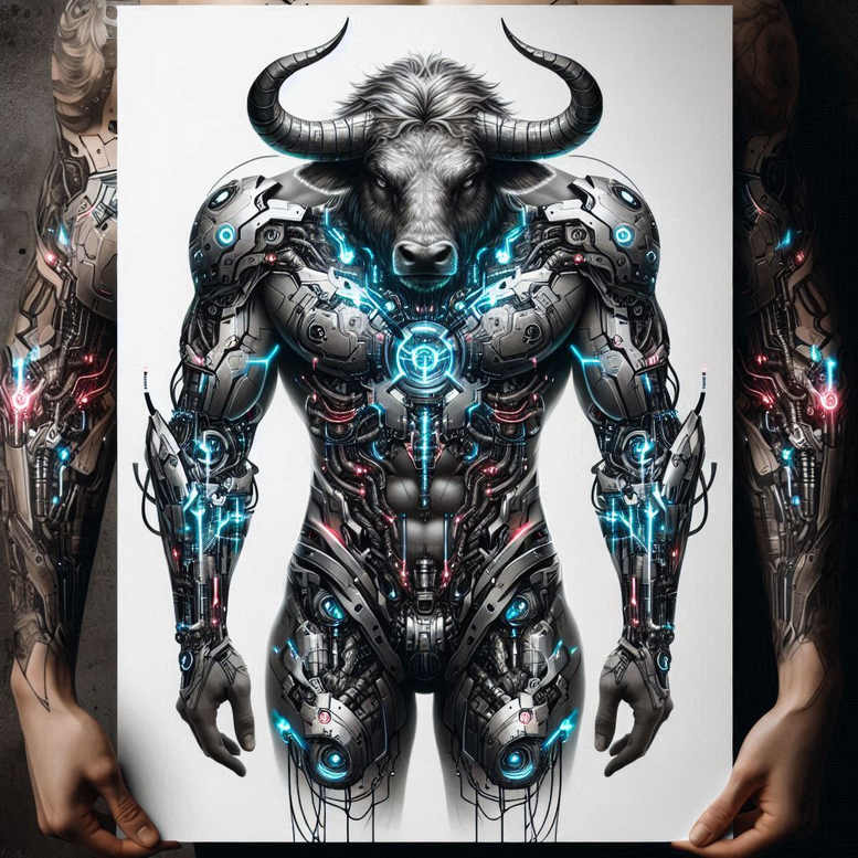 This AI-generated tattoo design presents a formidable Minotaur-inspired figure armored in ornate plating, standing with stoic poise and a radiant blue runic glow along the chest and limbs. The piece embraces a fantasy realism aesthetic with bold black lines and saturated blue highlights, delivering a dramatic, high-contrast silhouette suited for a large body canvas, such as a back or chest sleeve. The central Minotaur’s head features imposing curved horns, while the torso is enveloped in segmented armor that bears intricate engravings and symmetrical patterns. The luminous runes trace the armor’s seams, suggesting magical protection and inner power, while the cool blue tones evoke a mechanized, otherworldly energy that contrasts with the dark ink. The composition emphasizes symmetry and balance, guiding the viewer’s eye from the horned crown down through the armored torso to the crisscrossed gauntlets and armored boots, creating a cohesive narrative of strength, discipline, and resilience. Symbolically, the Minotaur embodies primal strength and a complex dual nature—beast and man—tied to the labyrinth motif of Greek myth, challenging the wearer to conquer internal fears and obstacles. The blue rune glow can be interpreted as wisdom and protective energy, a motif often associated with guidance through darkness. As a project or idea, this design combines tonal shading with fine line accents to highlight texture on metal and skin, rendering a visceral impression of power and mysticism. Given its dark dominant palette, the tattoo is especially suitable for a cover-up on existing heavy ink, transforming prior marks into a dramatic centerpiece. Patterns recur in the armor’s engravings and metallic panels, reinforcing a sense of rhythm and unity across the design, while the overall aesthetic aligns with modern fantasy and digital-art sensibilities, appealing to collectors of meaningful tattoos and lovers of myth-inspired ink. Note: this is AI-generated tattoo art, crafted to explore mythic symbolism and contemporary technique; the meaning resonates with themes of resilience, labyrinthine journeys, and protection through adversity, making this a compelling choice for a long-term, meaningful tattoo design.