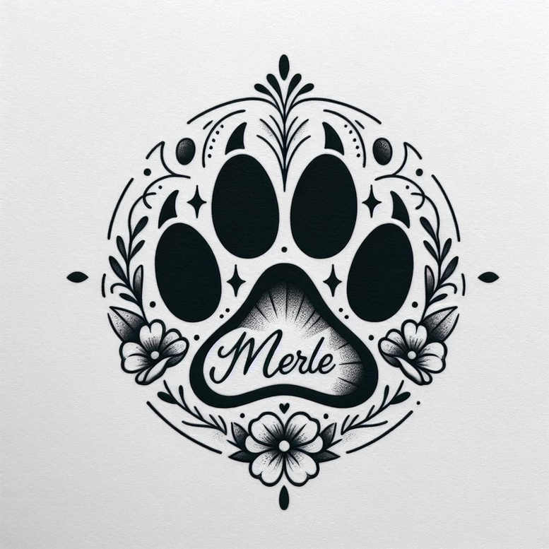 This AI-generated tattoo project centers on a bold black paw print encircled by a stylized floral wreath. The paw’s four pads are solid black, with the central pad housing the name Merle in an elegant script. A bouquet of petals, small blossoms, and curling leaves forms a balanced circular frame that radiates symmetry and classic tattoo ornament. The piece relies on clean linework and solid black fills, with subtle shading at the edges to suggest depth and give the paw a dimensional feel while preserving legibility of the script. The floral elements weave around the paw like a decorative mandala, echoing traditional motifs found in flower tattoos and blackwork ornament. This pattern-driven composition makes the tattoo versatile for various placements, from forearm to calf, and scales well as a cover-up because the dense black areas can mask older ink. As a meaningful tattoo design, it can symbolize loyalty, memory, and companionship associated with a beloved pet, while the blossoms convey growth and renewal. The design leans toward a black and grey palette and a slightly Japanese-inspired ornamental style, but remains accessible for fans of fine line tattoo and rose tattoo design aesthetics. For artists, the file offers clear separation between the solid shapes and the delicate linework, enabling crisp ink transfer and durable aging. This is an AI-generated tattoo project, intended as a reference for a skilled tattooist to tailor to client anatomy, skin tone, and preferred size; the pattern-like floral elements ensure the design is both decorative and meaningful, and the black and grey palette reinforces its versatility as a cover-up piece. Edges of the leaves and petals are crisp with fine texture, using a single-needle approach for detail, while the solid black fill employs subtle gradient whip shading to preserve smooth transitions on the skin. The concept nods to traditional Japanese ornament and modern blackwork language, blending elegance with bold silhouette. The Merle name adds a personal anchor, turning the piece into a meaningful tattoo that celebrates loyalty and memory, while the surrounding flowers create a timeless frame that remains legible as ink ages. This cover-up-ready design suits a range of placements from forearm to calf and scales well for both small tattoos and larger body art projects.