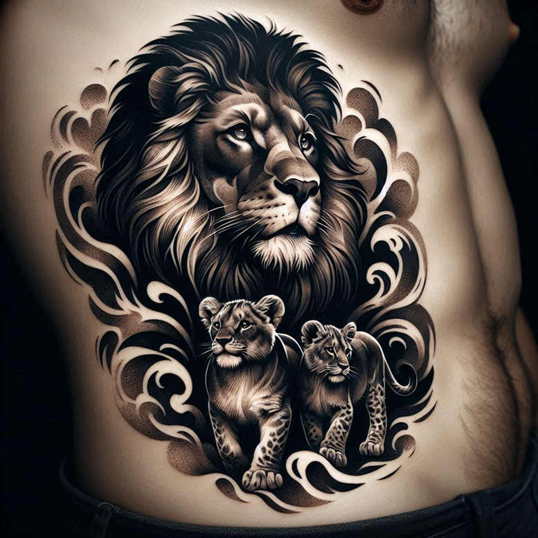Created as an AI-generated tattoo project concept, this design features a dominant adult lion flanked by two cubs, rendered in black and grey with a fluid backdrop of ornamental swirls. The composition sits on a broad side canvas, the lion’s head lifted, while the cubs step forward in a protective stance. Sweeping pattern swirls frame the animals, weaving around fur textures and forming a cohesive design. Shading relies on careful black-and-grey gradation and negative space to separate mane, eyes, and pattern work, achieving a balance between bold silhouette and subtle radiance. The lion’s calm, watchful expression communicates strength and guardianship, while the cubs convey curiosity and family bonds. The technique blends realism with graphic ornament: solid outlines, smooth gradients, stippling, and fine lines to render fur, facial features, and the surrounding pattern without sacrificing readability at larger scales. The surrounding elements act as a metaphor for lineage and protection, and the piece can be expanded into a larger sleeve or kept as a striking side tattoo. In terms of suitability, the dark ink makes this concept a prime candidate for a cover-up if desired, and the pattern motifs provide versatile options for personalization. While not tied to traditional motifs, the execution leans into black-and-grey realism with contemporary ornamental patterning, making it compatible with various placements and body art goals. As an AI-generated tattoo project, this concept offers a timeless, meaningful design that aligns with tattoo design principles and market demand; it can be adapted into a custom tattoo design with attention to skin tone and healing considerations. Keywords to optimize reach include tattoo, tattoo design, meaningful tattoos, fine line tattoo, lion and cub, black and grey, realistic tattoo, pattern, cover-up, and ink.