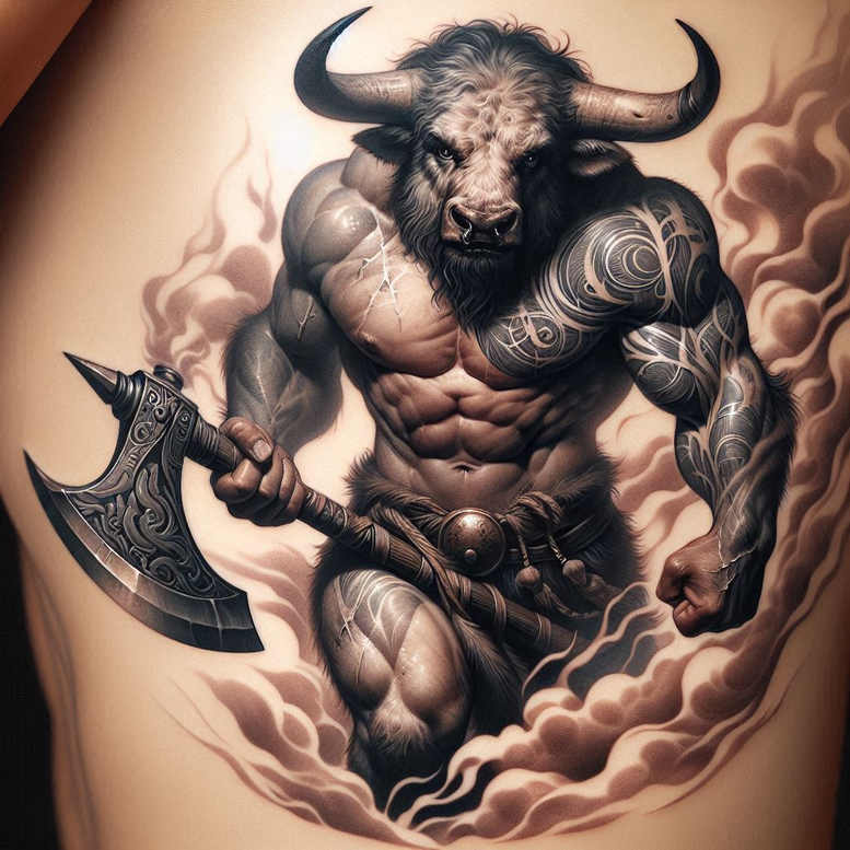 This black and grey tattoo design centers on a Minotaur, a powerful Greek mythic monster, rendered with muscular anatomy and a menacing horned head gripping a double-edged battle-axe. The composition fuses sculptural realism with dynamic motion, as the minotaur strides forward through a swirl of smoke and rising flames that frame its figure. The artist employs deep chiaroscuro shading to carve the musculature and fur into high-relief form, while selective white highlights accent the axe blades and the horns, creating a striking contrast that reads well on skin. The subject embodies a dual symbolism: strength and primal energy anchored in myth, balanced by restraint and ritual danger implied by the labyrinthine background. The battle-axe anchors the design to themes of battle, protection, and decisive power, while the horns emphasize the animal nature of the beast and the fierce resolve often associated with legendary guardians. In a broader context, the Minotaur has long stood as a symbol for inner conflict—the clash between civilization and wild instinct—making this tattoo meaningful for wearers who identify with personal transformation or overcoming adversity. The piece is designed for a bold, immersive sleeve or back placement, with the smoke and flame elements providing negative space for flowing composition. The mythological reference is explicit, yet the interpretation remains versatile for personal lore, such as a nod to labyrinth lore or to a warrior’s journey. As an AI-generated concept, the design explores modern tattoo aesthetics while staying anchored in classical myth, using meticulous line work and soft transitions to achieve a realistic tattoo look, a hallmark of quality body art ink. For color theory, the piece relies on black and grey gradients to convey depth and texture, offering a timeless option that ages gracefully. The resulting image speaks to collectors seeking meaningful tattoos with narrative resonance, as well as to artists pursuing a custom tattoo design that marries myth with contemporary technique. The suggested symbolism resonates with tattoo lovers and cultural enthusiasts alike, highlighting how mythic creatures can become personal emblems. If you’re considering cover-up possibilities, the strong dark values and dense shading help conceal earlier marks, making this design a prime candidate for a cover-up. The concept is clearly aimed at a high-impact, premium skin art experience, and the AI-generated nature of the design emphasizes its origin as a fresh interpretation of an ancient icon. The overall mood is intense, immersive, and crafted to read as a statue-in-motion, inviting ongoing conversation about strength, myth, and the human journey while reinforcing the tattoo’s role in personal storytelling and ink collection.