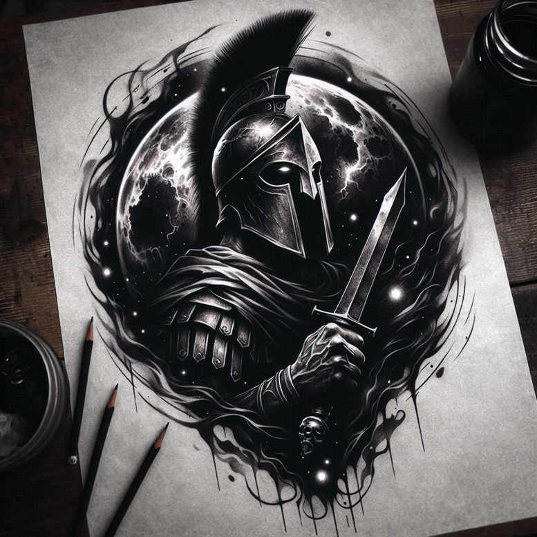 This is an AI-generated tattoo project concept featuring a heavily armored knight in a sculpted helmet, gripping a blade, and surrounded by a circular lunar backdrop with smoky, decorative swirls. Rendered in high-contrast black and grey, the knight’s plate, gauntlet, and cloak are sculpted with dense graphite shading and fine line work to capture texture and weight, while the full moon behind creates a radiant halo that intensifies the drama. The circular frame and looping accents form a graphic pattern that defines the silhouette, providing a bold visual for large-scale placements such as backpieces or forearms, and also adapting well to smaller tattoos by preserving core lines. The composition centers the warrior within a ring, leaving negative space at the edges to support a seamless cover-up of existing markings. Symbolically, the knight stands for protection, resilience, and duty, with the moon alluding to mystery and cycles—a meaningful tattoo concept for someone seeking a powerful protective motif. The technique blends realism with illustrative line work, producing a durable black and grey tattoo design that ages gracefully on skin. While it leans toward a classic knightly fantasy, it can be reinterpreted in Japanese style tattoo terms or simplified for smaller applications without losing its essence. The AI-origin note emphasizes this is an AI-generated tattoo project, illustrating how machine-assisted concepts can inform traditional tattoo artistry. For clients searching for a striking, pattern-rich cover-up, this design offers a solid foundation for a tattoo that combines realism with graphic flair, suitable for a range of placements from sleeves to chest pieces.