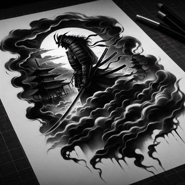 This AI-generated tattoo project presents a bold, Japanese-inspired scene rendered in black and grey tones. A solitary samurai stands in armor, the lacquered plates and sinewy lines captured with careful shading that suggests movement and weight. In one hand the figure grips a curved katana, its blade catching a glint of imagined light, while a distant multi-tiered pagoda anchors the composition to traditional temple imagery. Surrounding the warrior, billowing clouds churn and swirl, their edges carved in thick-to-thin gradients that give the piece a sense of wind and tension. The design relies on high contrast, dense vellum-black shadows, and crisp linework to create depth as if the scene emerges from the skin. The clouds and waves in the foreground read like graphic patterns, providing a stylized backdrop that can work well as a cover-up for older, darker ink, while the central figure remains the focal point. The overall composition balances verticality with movement, letting the katana gesture echo along the arm or calf where the tattoo might travel. In Japanese style tattoo traditions, the samurai embodies courage, honor, and the tension between duty and fate, while the pagoda nods to heritage and the sacred spaces of training and discipline. This black and grey study emphasizes texture over color, using stippling and smooth gradient shading to render metal, fabric, and stone with tactile realism. Though the motifs are classic, the execution is modern, layered with negative space and flowing winds that invite the skin’s natural curves to contribute to the drama. For clients seeking meaningful tattoos, this design offers a strong narrative—an alloy of history and personal resolve—while remaining adaptable to different body placements. It’s also a compelling option for a cover-up, given the dark masses and bold silhouettes that can effectively conceal previous work. As an AI-generated tattoo project, this piece highlights how contemporary processes can translate enduring symbols into pigment with precision, delivering a versatile template for a large, striking black and grey tattoo design that can be refined to suit individual anatomy and line preference. Keywords to explore include tattoo design, meaningful tattoos, fine line tattoo, lotus flower tattoo, infinity tattoo, tribal tattoo, rose tattoo design, small tattoos, flower tattoos, custom tattoo design, Japanese style tattoo, black and grey, realistic tattoo, body art, and ink.