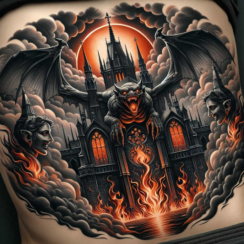 This AI-generated tattoo project presents a monumental Gothic castle engulfed in flames, anchored by a blood-orange halo and set against roiling charcoal clouds. At the heart of the design a dragon- or demon-faced gargoyle crouches on the battlements, its jaws open in a roaring blaze, while two winged guardians flank the fortress, adding symmetry and motion as if the scene is erupting from the skin. The piece relies on dense black and grey shading to carve stone textures, flickering torches, and weathered gargoyle features, with hot orange and crimson flames licking upward to create dramatic contrast. The composition reads as a single, sweeping back- or chest-piece, designed to flow with the body’s contours and to maximize negative space around the central monument. The sky teems with moody clouds that curl and swirl, guiding the eye toward the fiery center and the crowned circle behind—the halo that elevates the image to a mythic stage. The project intentionally embraces high contrast and meticulous line work to evoke a dark fantasy mood, suitable for a bold sleeve or large panel. The image is clearly an AI-generated tattoo project, reflecting contemporary digital design methods while remaining legible in tattoo ink. Because of its overall darkness and strong coverage of the skin, it doubles as an excellent cover-up option for existing lighter, more glaring pieces, allowing old marks to be safely concealed beneath the fortress of flames. From a symbolism standpoint, the castle represents resilience, the flames signal transformation, and the gargoyles act as guardians against past horrors; together they convey a meaningful tattoo design about endurance and rebirth. SEO-wise the narrative weaves keywords such as tattoo, tattoo design, meaningful tattoos, black and grey, realistic tattoo, body art, ink, rose tattoo design, lotus flower tattoo, infinity tattoo, tribal tattoo, custom tattoo design, small tattoos, and Japanese style tattoo, noting that this piece leans toward dark fantasy and cover-up capability, while also nodding to Gothic architecture and fire imagery.