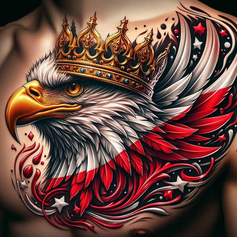 AI-generated tattoo project concept realized as a full-color chest piece: a regal eagle head wearing a gilded crown, its beak and eye rendered with meticulous shading, while sweeping wings and ornamental motifs erupt in red and white along the chest. The piece uses a blend of realistic shading and graphic patterning, with bold outlines, smooth color transitions from bright crimson to deep burgundy, pure white highlights, and jet-black shadows to create depth. The crown is detailed with jewels and fine metallic texture, the feathers are layered to create motion, and star accents punctuate the design. The composition balances emblematic symbolism: the eagle representing strength and courage, the crown denoting authority, and the decorative flourishes suggesting movement and cosmic energy. The result is a striking tattoo design suitable for men and women seeking a statement piece, fitting for a large body area; it pairs well with Japanese style tattoo influences in its disciplined linework and dramatic contrast. This is an AI-generated tattoo project, showcasing the potential of AI-assisted design to produce bold color work and intricate patterning.
