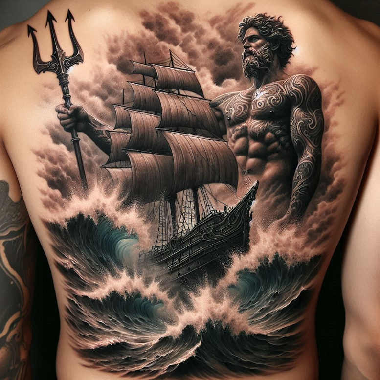 This is a tattoo gallery inspired by Poseidon from Greek mythology. The back piece presents a commanding figure of Poseidon as a muscular, bearded god, rendered in vibrant color with a stormy sea surrounding him. The trident is raised high, its prongs catching light as dark clouds roll across the horizon, while a wooden sailing ship leans into a towering breaker. Waves curl with careful rhythm, their spray seeming to leap across the skin, and sails billow with wind, giving the scene a cinematic energy. The composition places the god at the upper back, the ship deeper on the spine, and the sea tying the elements together in a continuous arc. The color palette relies on deep blues, turquoise, and slate gray, tempered by warm skin tones and bright white highlights to create a sense of depth and realism. The shading moves from soft gradients to crisp linework that defines Poseidon’s musculature, the folds of his cloak, the knotted rigging, and the weathered hull of the ship. Symbolically, the design speaks of mastery, courage, and endurance: Poseidon’s trident stands for control over water, storms, and fate, while the sea represents life’s unpredictability and resilience. The ship evokes voyage, risk, and the human desire to explore the unknown, and the waves embody constant change and renewal. The overall mood reads as epic and mythic, inviting the wearer to identify with strength and connection to the ancient sea. This project/idea is an AI-generated design, offering bold storytelling through tattoo art and color realism. For enthusiasts of meaningful tattoos, this piece demonstrates how mythic iconography can translate into a large back piece that remains legible from a distance yet rich in detail up close. The Poseidon-inspired theme, the interplay of sea and sky, and the iconic trident draw on classical iconography to create a timeless narrative in ink. Repeating wave motifs provide a subtle pattern across the composition, enhancing flow while maintaining clarity, and the overall concept celebrates myth as living ink, a statement of personal power and reverence for the sea.