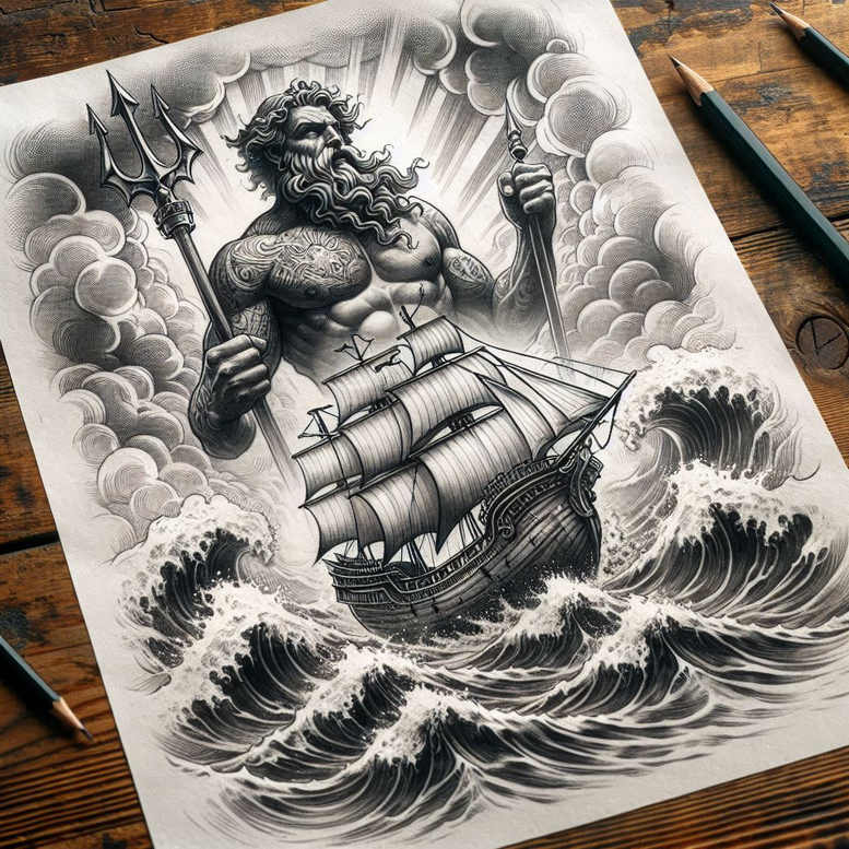 Poseidon-inspired storm-charged seascape tattoo concept presents a dominant figure of Poseidon rising from the roiling depths, standing atop a weather-worn ship as if commanding the elements, his trident raised in a gesture of authority. Rendered in black-and-grey with careful cross-hatching and smooth gradient shading, the piece relies on fine-line precision to convey texture in the sails, rigging, spray, and the surface of the sea, while the surrounding skies carry a sense of wind and gravitas. The composition anchors the eye at the god’s muscular torso and stern gaze, then guides it along the diagonal sweep of waves toward the crested prow and back to the trident’s prongs that catch light with subtle highlights. The ship becomes a stage for myth rather than a literal vessel, its lines and panels stylized to read clearly on skin, balanced by the organic curves of waves that ripple in a rhythm reminiscent of traditional maritime tattoos yet rendered with a contemporary, painterly confidence. In terms of meaning, the design fuses power, control, and resilience: Poseidon embodies mastery over water, storms, and cyclic renewal; the trident stands for authority and the ability to shape fates; the turbulent sea and crashing waves symbolize challenges faced and overcome, while the ship evokes a personal journey and the courage of travelers who navigate uncertainty. The grayscale palette ensures a timeless aesthetic, suitable for a wide range of skin tones, and the level of contrast makes this tattoo design legible even from a distance, yet rich with detail up close. The piece is presented as an AI-generated concept, offering a bold, modern interpretation of myth with cinematic clarity that works as a standalone statement or as a compelling cover-up option where older tattoos invite transformation into a mythic scene. Additionally, this Poseidon-inspired motif aligns with the broader history of mythic sea deities in tattoo culture, appealing to fans of meaningful tattoos, black and grey realism, and fine-line tattoo sensibilities, while inviting ongoing dialogue about symbolism and personal narrative in body art.