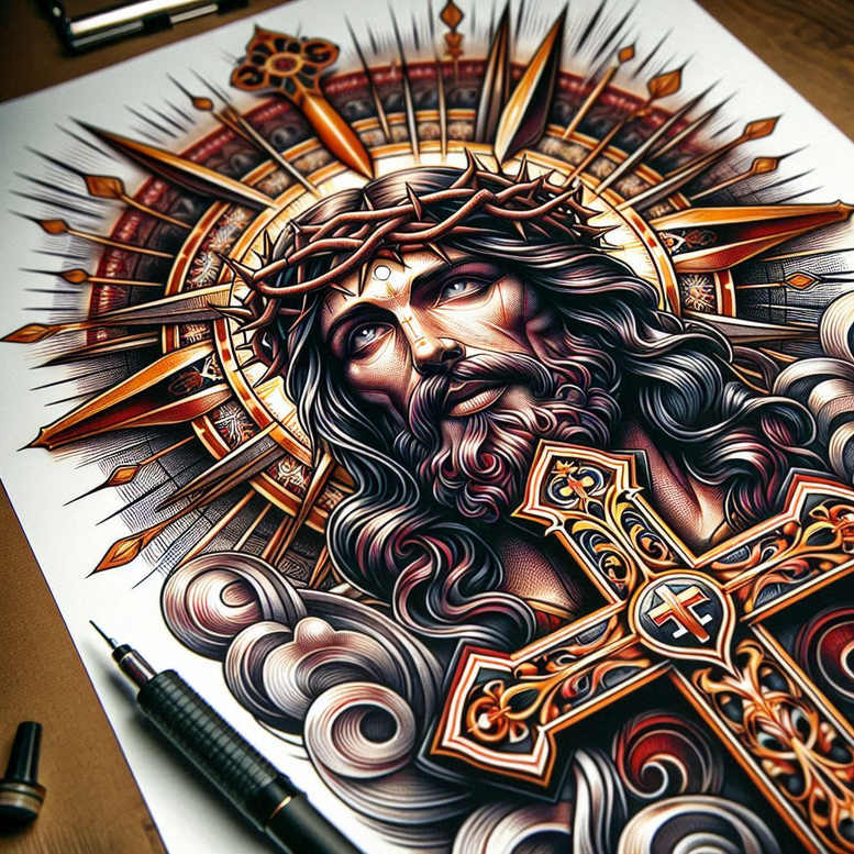 AI-generated tattoo projects present a powerful, sacred image of Jesus Christ anchored by a cross and crown of thorns. This full-color realization centers the Savior’s visage, framed by a luminous halo and an ornate cross that features knotwork patterns and ceremonial decoration. The design blends reverent iconography with contemporary tattoo craft, using bold linework to define features and color-rich gradients to model skin tone, fabric, metal, and wood. The crown of thorns threads across the brow in detailed browns, while the cross bears metallic gold and deep shadows that give it weight and presence. The halo behind Jesus emits rays that form an intricate radiating pattern drawing the eye to the face and conveying divine light. The background remains understated to keep the sacred emblem the focal point, but the panel-work across the cross and halo adds texture and visual interest for a large-format piece. Technically the piece demonstrates a synthesis of realism and decorative pattern, with crisp edges for readability on skin and smooth color transitions to avoid lost details as the tattoo ages. The palette balances warm skin tones with cool blues and golds, producing a dynamic contrast that captures spiritual intensity. In terms of symbolism, the image unites the passion of Christ (cross and crown of thorns) with divine sanction (halo) to evoke faith, hope, and redemption. The tattoo stands as a meaningful tattoo design for believers and enthusiasts of Christian iconography, offering flexibility in placement — chest, back, or sleeve — while preserving legibility of core elements. As an AI-generated concept, this project invites adaptation to different skin tones and sizes through line weight and color choices, reinforcing its suitability as a custom tattoo design. Key visible elements include Jesus, cross, crown of thorns, halo, and machine; the cross features intricate knotwork that adds a decorative pattern and elevates the sacred mood. This is a personal, spiritually charged tattoo design that merges traditional symbolism with modern ink artistry, appealing to those seeking meaningful tattoos that celebrate Jesus and the Christian story, and aligning with trends in black and grey alternatives or full-color tattoo work.