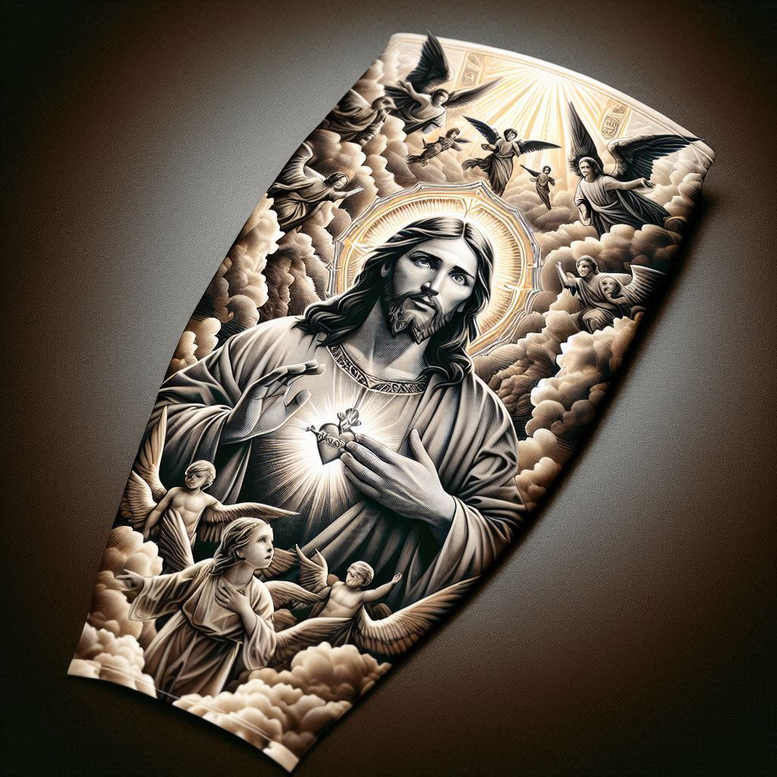 This design presents a contemplative Jesus panel carved in tonal black and grey, a nod to sacred iconography reimagined for modern tattoo art. The central figure of Jesus is rendered with serene expression and a modest gesture of blessing, hands crossed over the chest, while a luminous halo radiates around the head, signaling divinity and grace. Surrounding him, cherub angels drift among stylized clouds and decorative motifs that echo medieval reliquary ornament, transforming the sacred scene into a wearable meditation on faith. The composition blends realism with ornamental patterning, encouraging the eye to wander across the panel from the intimate folds of the robe to the delicate shading on faces and wings. The panel as a motif evokes temple altars and altar screens, but translated for skin as a timeless piece that can anchor a large back, chest, or sleeve, yet remains adaptable for a refined forearm session. The technique emphasizes black and grey gradients, crisp linework for the figures, and soft transitions that preserve clarity as the tattoo ages. Symbolically, Jesus represents guidance and salvation; the halo signifies divine illumination; angels function as guardians and witnesses to the sacred moment, while the clouds imply a celestial space beyond ordinary life. The result is a meaningful tattoo design that balances reverence with artistry: a fine line tattoo approach married to a robust panel composition, suitable for those seeking a traditional yet contemporary expression of faith. This is an AI-generated tattoo project, offering a template for a custom tattoo design that honors devotion, invites reflection, and lends a solemn rhythm to the wearer’s body. With its high-contrast shading and pattern-like ornamentation, the piece can be scaled for larger canvases or refined for smaller placements, all while maintaining a cohesive sacred narrative and timeless aesthetic that speaks to devotion, protection, and timeless ink. Detailed elements include the drapery folds of Jesus’ robe, the delicate feathering on the wings of the angels, and a subtle texturing of the clouds that creates a layered, three-dimensional feel. The design also resonates with fans of realistic black and grey tattoos and traditional sacred imagery, offering a versatile template for a custom tattoo design that remains meaningful across different skin tones and body placements.