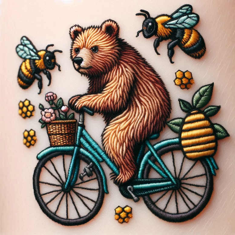 An AI-generated tattoo project concept, this piece presents a bear riding a teal bicycle with a wicker basket blooming with tiny pink flowers, a honeycomb motif on the rear rack, and a cluster of bees buzzing nearby. The composition uses bold satin-stitch-like outlines and crisp color blocks to emulate embroidery, blending graphic simplicity with textured shading to suggest fur, metal, and natural elements. The color palette is bright and primed for ink: warm browns for the bear’s fur, vibrant turquoise for the bicycle, honey-yellow hexagons, fresh greens for leaves, and soft pinks for flowers, all arranged to create a harmonious contrast that reads clearly as a tattoo design from a distance and rewards closer inspection with richer texture. The bears’ stance—one paw on the handlebar and the other resting on the frame—gives a sense of motion and whimsy, while the wicker basket foregrounds flowers that symbolize growth, renewal, and playful curiosity. Bees weave around the scene, their wings catching light, and the honeycomb motifs establish a repeating pattern that adds rhythm to the piece, making it suitable as a full-color tattoo design on the upper arm, calf, or shoulder sleeve. In terms of technique, the design favors solid color fills, minimal shading to maintain print-friendly readability, and clean, continuous lines that enhance legibility on skin and ink preservation. The patchwork-like aesthetic nods to traditional tattoo methods while embracing contemporary vector-inspired clarity, and the overall mood remains uplifting rather than aggressive, aligning with meaningful tattoos that celebrate nature, whimsy, and personal growth. For collectors seeking a small-to-medium, eye-catching tattoo with a blend of floral, insect, and mechanical motifs, this concept offers a distinctive route to a custom tattoo design that is lively, symbolic, and versatile. Notably, as an AI-generated tattoo project, it remains adaptable to preference shifts in line density, color palette, or scale and can be reimagined in black and grey or toned down for a subtler statement, while still preserving the core bear-on-bike narrative and the inherent patterning that makes it a cohesive, pattern-oriented composition.