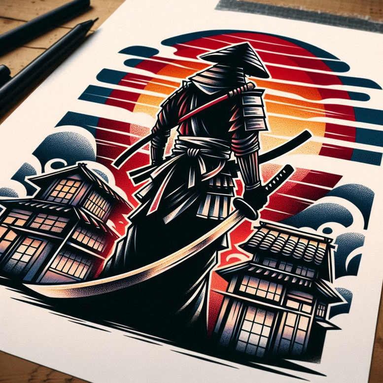 An AI-generated tattoo project in a Japanese-inspired graphic style, this design centers on a cloaked samurai standing in a bold, forward-leaning pose. The figure wields a katana across the back and another blade at the hip, rendered in high-contrast black and grey with crisp lines and subtle gradient shading that suggest steel and fabric. Behind the warrior rise two tiered pagodas and a large red sun, with stylized clouds and sweeping geometric bands that lend a sense of motion and rhythm to the composition. The artwork blends contemporary vector precision with traditional iconography, using solid silhouettes and carefully placed negative space to create depth and balance. The color palette is deliberately restrained: black and grey ink anchors the piece while the red sun provides a vivid accent, making the tattoo design pop on skin and ensuring strong visibility from a distance as a standalone piece or as part of a sleeve. Symbolically, the samurai embodies discipline and courage; the katana signifies cutting through obstacles; the pagodas anchor the scene in a temple-like setting, evoking heritage and reverence. This design is particularly suited for covering up older work due to its dense silhouette, bold edges, and strategic shading that can be leveraged to mask underlying ink while preserving a striking, cohesive image. As an AI-generated tattoo project, it demonstrates how modern technology can yield meaningful tattoos that resonate with ink enthusiasts seeking a Japanese style tattoo with a contemporary graphic edge. Keywords woven into the description include tattoo, tattoo design, meaningful tattoos, fine line tattoo, Japanese style tattoo, black and grey, realistic tattoo, and ink, along with broader concepts like small tattoos, flower tattoos, and custom tattoo design.