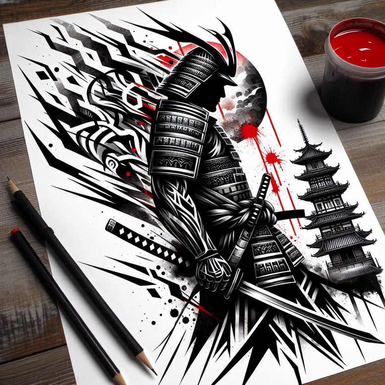 AI-generated tattoo project presented as a bold black and grey composition featuring a solitary samurai in ornate armor, gripping a katana as if frozen in motion. The figure dominates the foreground with crisp linework and dense shading, while a traditional pagoda rises on the right, its multi-tier silhouette contrasting with jagged, graphic shards that radiate outward. Red ink splashes punctuate the composition, providing a dramatic counterpoint to the monochrome palette and guiding visual flow from blade to temple. The piece embraces a high-contrast, graphic style that nods to Japanese style tattoo aesthetics while remaining suitable for contemporary body art applications. This design relies on strong, solid blacks and precise gradient transitions to render texture in armor plates and the lacquered wood of the pagoda, creating depth and a sense of movement that would translate well to a large-scale back piece or forearm tattoo. The pattern-like background evokes motion and energy, turning negative space into a wild, dynamic field that frames the central figure. In practical terms, the design is positioned to cover up existing darker work: the dense black areas and layered shading can effectively mask prior ink, while the new lines reframe the subject with bold silhouette and controlled negative space. The artwork also serves as a striking example of a tattoo design suitable for both Japanese style tattoo enthusiasts and fans of black and grey, high-contrast body art. As an AI-generated tattoo project, it demonstrates how modern algorithms can craft cohesive narratives—combining mythic warrior symbolism with architectural silhouette—to deliver a meaningful tattoo concept. Keywords: tattoo, tattoo design, meaningful tattoos, fine line tattoo, lotus flower tattoo, infinity tattoo, tribal tattoo, rose tattoo design, small tattoos, flower tattoos, custom tattoo design, Japanese style tattoo, black and grey, realistic tattoo, body art, ink. The piece is deliberately dark and intense, making it an ideal candidate for a cover-up while preserving artistic impact.