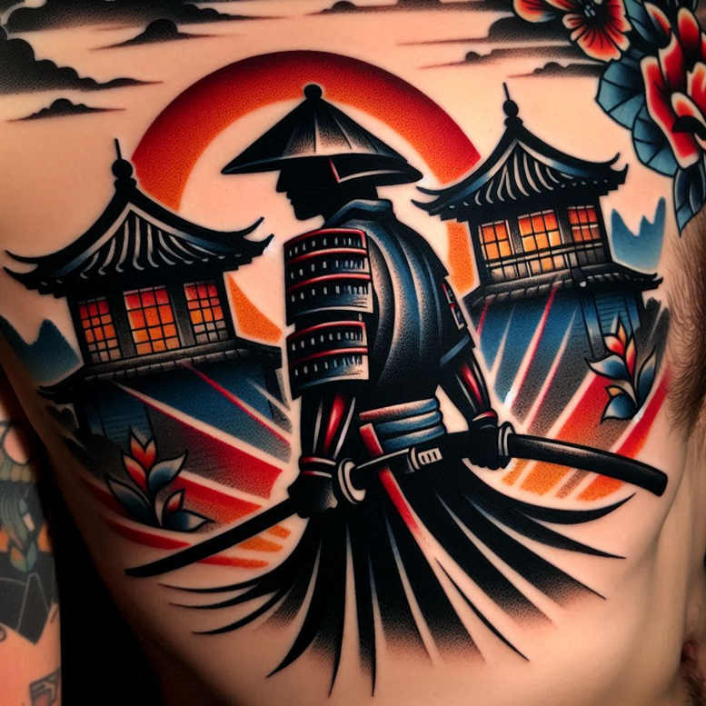 This is an AI-generated tattoo project presenting a bold Japanese-style composition that centers a samurai figure flanked by two pagodas, with a rising sun filling the background. The piece uses crisp, heavy black outlines and vivid color fills to create a high-contrast silhouette that reads clearly on skin. The armor is rendered with layered plates and subtle highlights to convey metallic surface and movement, while the flowing belt and skirt create dynamic lines that lead the viewer’s eye toward the temples and the circular sun. The pagodas are stylized with tiered eaves and windows, anchoring the composition and providing structural balance against the figure’s forward stride. The sun behind them glows in saturated orange and red tones, radiating outward with radii that offer an energetic halo that frames the scene and reinforces traditional Japanese tattoo motifs. On the right, a blue flower adds a splash of cooler color, providing contrast against the warm backdrop and helping to soften the piece’s bold geometry. The overall color strategy relies on primary hues and careful shading to avoid flat areas, with gradients in the sun, armor, and sky that give depth while preserving strong graphic clarity. The radial sunburst elements introduce a pattern-like cadence, which supports the theme of motion and fate. The tattoo design communicates meanings of discipline, honor, and renewal—classic associations with the samurai and with the rising sun motif in Japanese art—making it suitable for meaningful tattoos and personal symbolism. As an AI-generated tattoo project, it showcases how color blocking, clean line work, and traditional iconography can be combined into a large-scale piece appropriate for the chest or back. This design can be adapted as a custom tattoo design for those seeking a striking Japanese style tattoo or a bold color statement, demonstrating that even a complex image can remain readable in black and grey accents if desired, and offering opportunities for variations in dot shading or fine line detail for future iterations. Keywords woven through the narrative include tattoo, tattoo design, meaningful tattoos, fine line tattoo, lotus flower tattoo, infinity tattoo, tribal tattoo, rose tattoo design, small tattoos, flower tattoos, custom tattoo design, Japanese style tattoo, black and grey, realistic tattoo, body art, ink.
