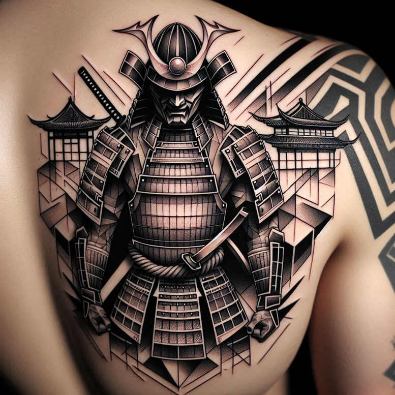 This is an AI-generated tattoo project concept featuring a dominant samurai armor back piece rendered in black and grey. The composition centers on a fully articulated kabuto helmet and lamellar cuirass, with katana blades tucked behind the shoulders and a braided rope belt binding the plates. On both sides rise stylized temple structures with sweeping roofs, forming a balanced backdrop that contrasts with the tight lattice shading of the armor. Crisp linework, bold black fills, and smooth grayscale gradients render metal plates, leather bindings, and rope textures with a hyper-realistic feel, while the surrounding geometry adds a modern graphic edge to the design. The overall silhouette reads large and bold, making it suitable for a back-piece tattoo and a striking cover-up where darker prior ink exists. The concept leans into Japanese style tattoo motifs: the samurai symbolizes discipline and protection, the armor conveys resilience, and the temple backdrop frames the warrior as a guardian for the wearer. Technique blends fine line elements for plate detailing with broad shading to suggest volume and reflective surfaces. As a high-contrast black and grey work, it rewards careful line work and ink distribution to retain clarity at distance. This tattoo design invites further customization with pattern-rich textures and potential additions like wave or cloud motifs, blooming lotus accents, or infinity symbols to deepen meaning. The piece also supports variations towards traditional or modern interpretations, expanding possibilities for small tattoos up to full backpieces. Being AI-generated: the concept can be refined by a tattoo artist into a custom tattoo design, preserving the dramatic contrast, composition, and storytelling embedded in the backpiece. It engages the viewer through contrast between the dark armor plates and lighter negative space, guiding the eye from helm to belt to the temple horizon. In the realm of ink, this piece sits at the intersection of black and grey realism, Japanese style tattoo, and modern geometric influence, offering a meaningful tattoo design for fans of tribal motifs or flower tattoos. This concept is ready for adaptation to suit client skin tone, placement, and healing considerations.