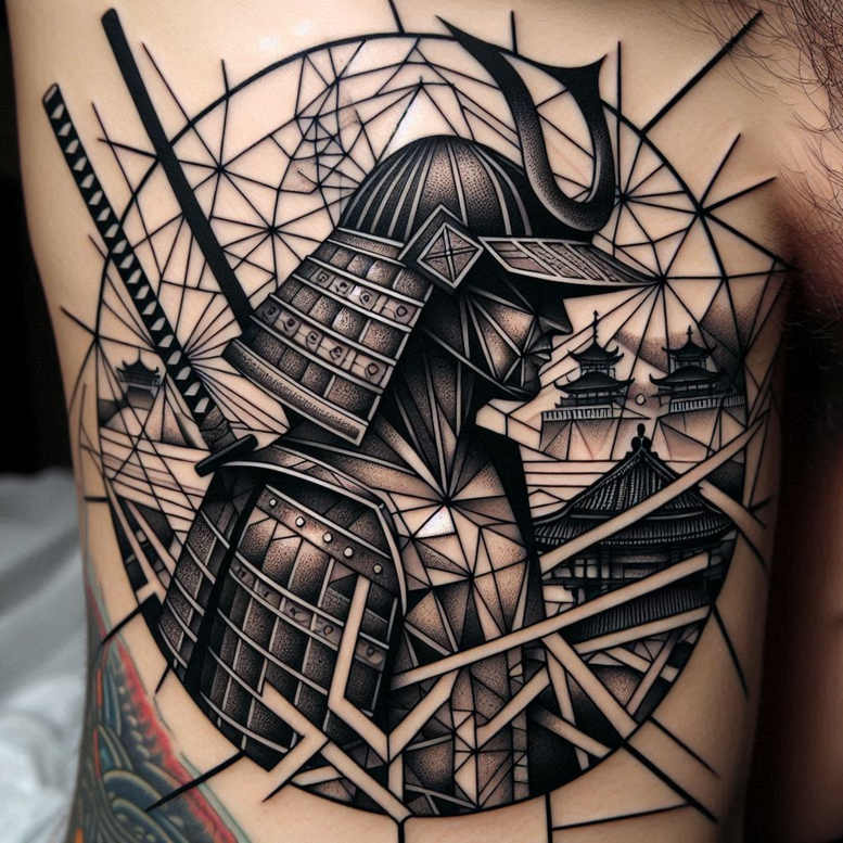 Defined by crisp black outlines and dense shading, this piece presents a geometric reinterpretation of a traditional samurai kabuto and armor. The helmet is rendered with layered platework and a horned crest, while two katana blades cross diagonally, creating a dynamic tension against a distant pagoda skyline. The surrounding field is carved from a lattice of triangles and slanted lines, a deliberate breakup of form that yields a modern, tessellated texture. The interplay of positive and negative space heightens contrast, ensuring the design reads clearly on skin and maintains legibility over time, a critical consideration for a cover-up tattoo. Executed in black and grey with careful stippling and dot-work, the piece balances solid blocks of shade against fine lines to evoke depth within armor plates and wooden structures in the background. The composition draws on Japanese tattoo motifs while pushing them into a contemporary geometric language, blending tradition with pattern-driven aesthetics. It speaks to themes of protection, discipline, and resilience, translating them into a visual metaphor of fragmentation and reconstruction—an ideal narrative for someone seeking a meaningful tattoo design that can cover an existing mark. The project concept is AI-generated, illustrating how algorithmic line-work and high-contrast shading can produce powerful body art that remains vibrant as a cover-up. In practice, the tattoo relies on precise line weights and spatial planning to preserve readability on varied skin tones, with an emphasis on longevity of black ink and smooth gradients. For seekers of a bold statement piece, this design offers a versatile canvas for placement on the upper arm or shoulder and invites customization around scale, angle, and background elements. In sum, it is a distinctive tattoo design that merges heritage imagery with contemporary geometry, suitable for those seeking meaningful tattoos, custom tattoo design, and striking black and grey body art that doubles as a cover-up option.