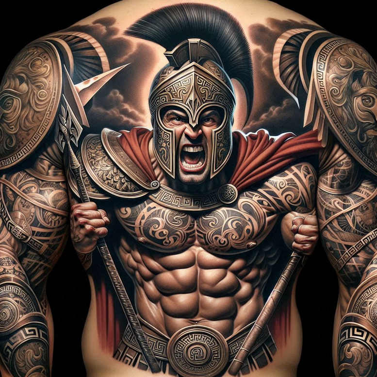 This is an AI-generated tattoo project that presents a dramatic Spartan warrior in a hyper-realistic, black and grey ink study. The central figure wears an ornate helmet with a bold crest, a crimson cape suggested by shading, and segmented armor whose intricate engravings sweep across the chest and shoulders. Flanking the warrior are round shields and long spears, creating a dynamic, symmetrical composition that directs attention to the molded abs and coiled musculature. The tattoos across the arms and chest function as a cohesive graphic pattern, weaving scrolling motifs, geometric borders, and interlocking designs that transform skin into a living canvas. Technique-wise, the piece blends smooth gradient shading with precise linework for the armor filigree, stippling for subtle skin texture, and high contrast to separate ink from the dark backdrop. Symbolically, the Spartan figure conveys courage, discipline, and warfare prowess, while the ornamental patterns evoke heritage and personal narrative carved into the body. Although grounded in Greco-Roman heroism, the design incorporates tribal and geometric influences to deliver a contemporary tattoo design suitable for large canvases or as a compelling focal point for smaller commissions. For tattoo enthusiasts seeking meaningful tattoos, this piece demonstrates how black and grey ink can produce cinematic impact, while remaining adaptable to various placements. Pattern work is central here; the motifs guide the eye along muscle curves and armor facets, turning the torso into a storytelling surface. If a cover-up is the goal, its bold blacks and sweeping patterns offer excellent opportunities to blend old ink into a fresh, coherent design. As an AI-generated tattoo project, it showcases how algorithmic artistry can craft timeless, durable body art with refined ink, linework, and shading that tattooists can execute with precision.