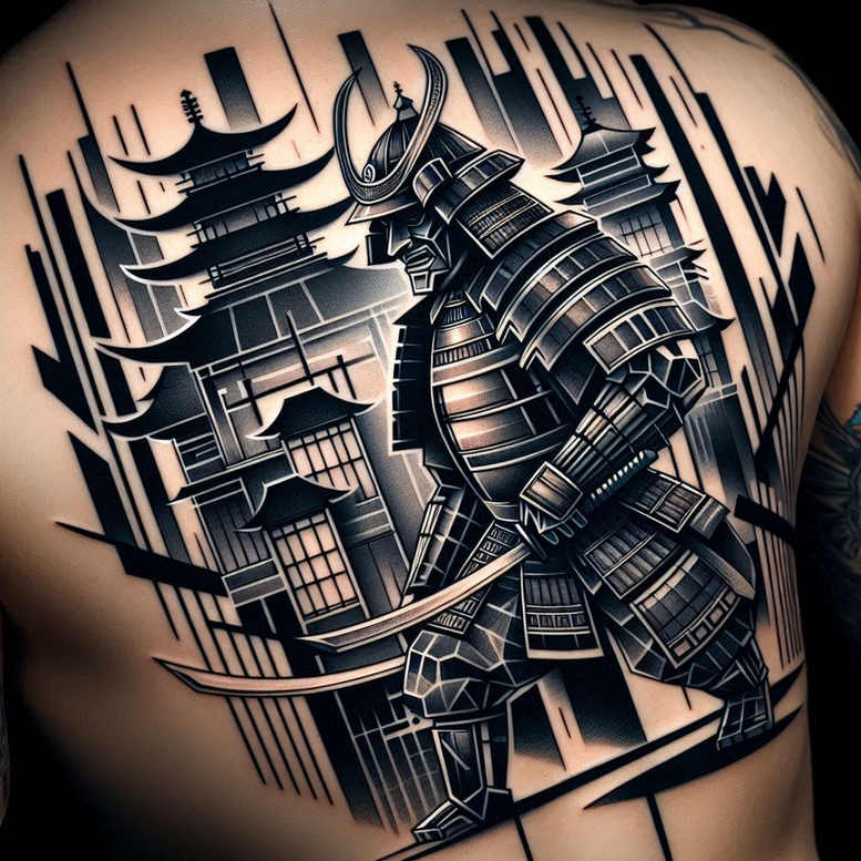 This tattoo design depicts a formidable samurai clad in layered armor, gripping a curved katana as he advances through a stylized cityscape of pagodas. Rendered in black and grey, the piece relies on bold negative space and crisp line work to carve a dramatic sense of depth and motion. The central figure dominates the composition, with lamellated plates and creases in the fabric conveying weight, discipline, and readiness for battle. Behind him rise a skyline of pagodas and angular towers; the juxtaposition of traditional Japanese architecture with a modern, geometric cityscape creates a visual tension that reads as both heritage and urban pressure. The pattern-like skyline is constructed from intersecting lines, blocks, and stepped forms that give the illusion of movement, echoing the samurai’s stride. The shading transitions from near-white highlights to deep blacks, producing strong contrast that remains legible at various scales, which is essential for a cover-up where another tattoo must be masked or transformed. The design invites interpretation: it can symbolize resilience, honor, and the mastery of a craft, while also offering a dramatic narrative about crossing cultural lines between past and present. For tattoo artists, the piece provides opportunities to adapt scale, refine the armor detailing, and tailor the background to fit different body regions without compromising readability. This is an AI-generated tattoo project, crafted to explore precision and cohesion between figure and backdrop while ensuring a cohesive black-and-grey palette. While the composition leans toward a bold, graphic style, it maintains a realistic feel through careful shading and controlled line density, making it suitable for a future cover-up or as a standalone statement piece. In sum, the concept merges Japanese influence with contemporary geometry to deliver a powerful body art design that speaks to tradition, strength, and personal meaning, and it aligns with SEO keywords such as tattoo, tattoo design, meaningful tattoos, and black and grey ink.